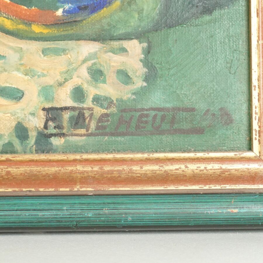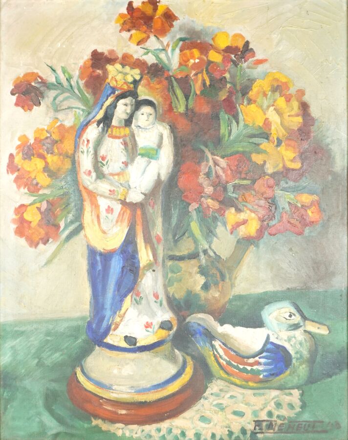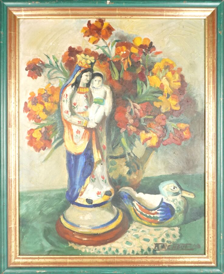 François MEHEUT (1905-1981), "Nature morte à la vierge à l'enfant en faïenceet au bouquet" 1948, huile sur panneau, signée et datée en bas à droite, 31 x 39,5 cm.
