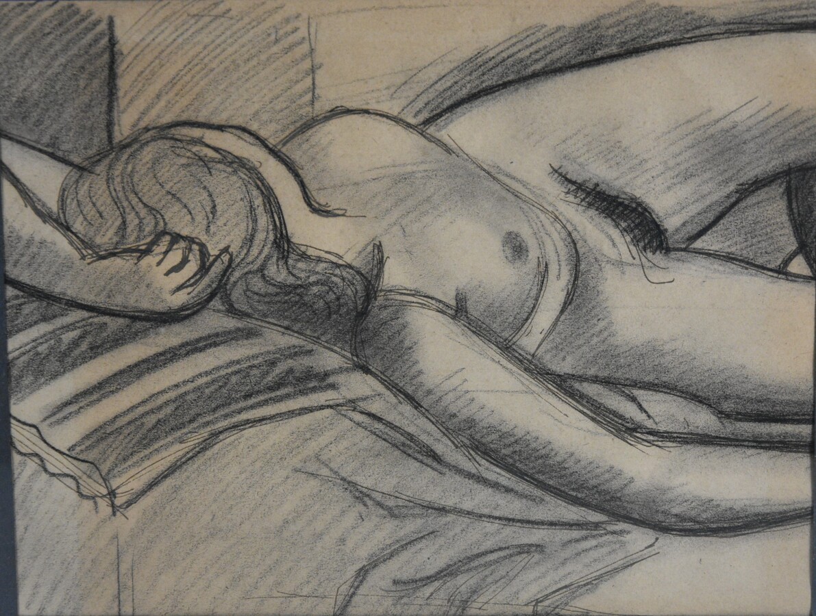 François Xavier JOSSE (1910-1991), "Nu de femme allongée", dessin au fusain et traits d'encre sur papier, 25 x 33.5 cm (à vue).