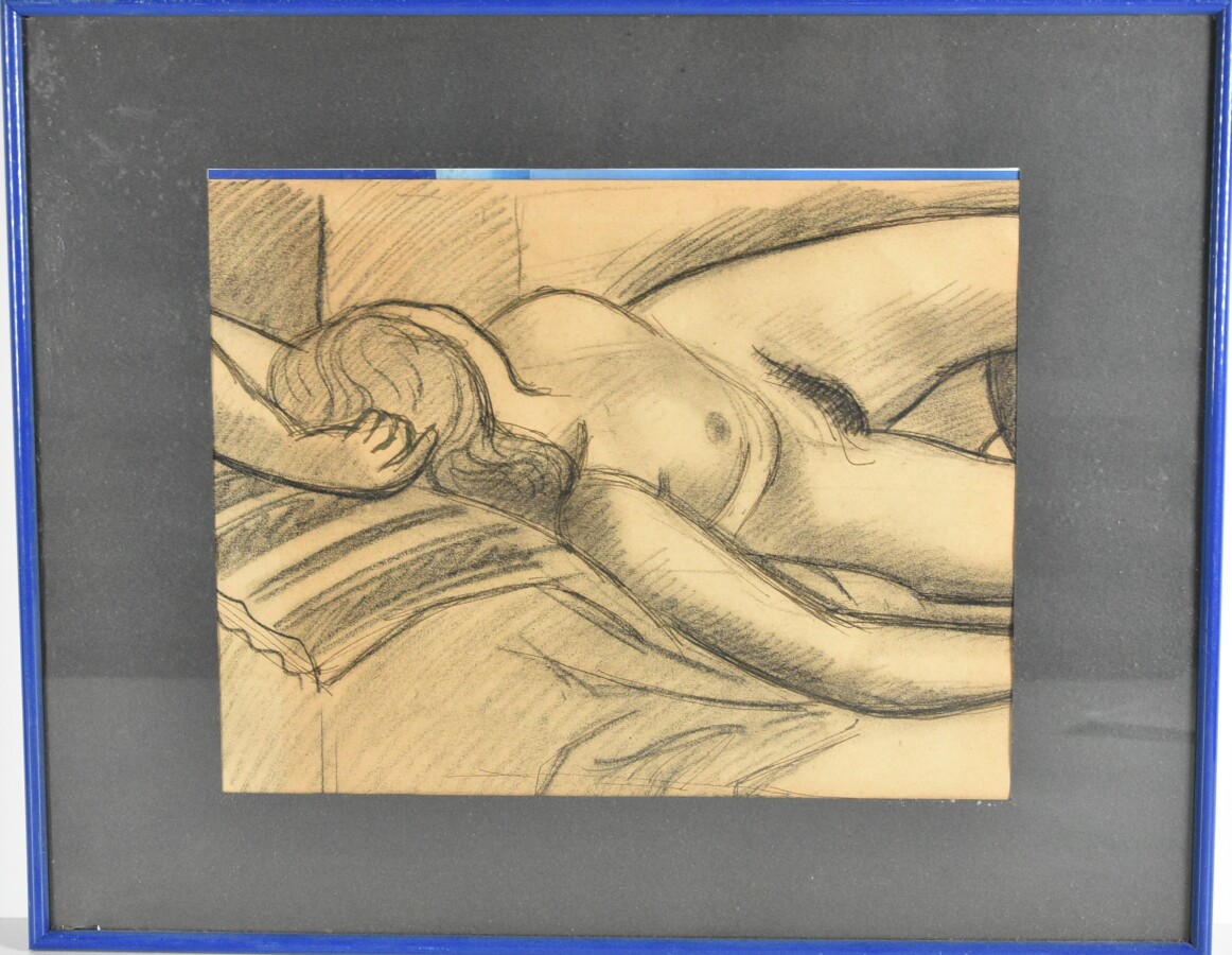 François Xavier JOSSE (1910-1991), "Nu de femme allongée", dessin au fusain et traits d'encre sur papier, 25 x 33.5 cm (à vue).