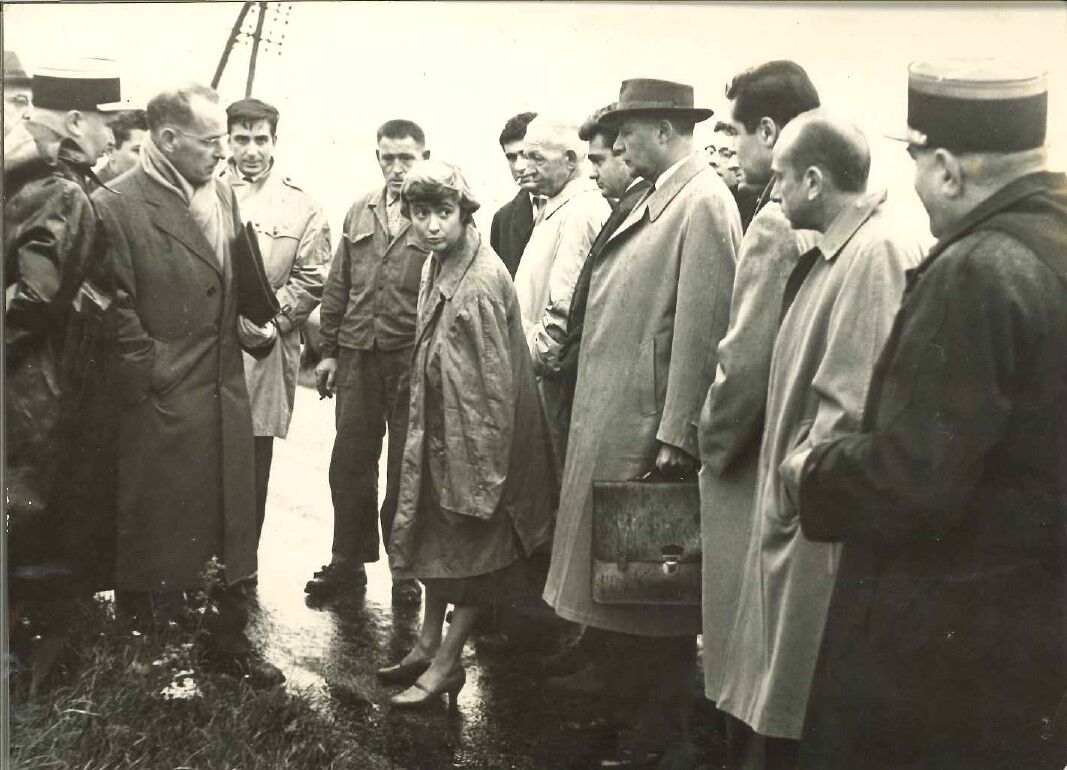 Françoise Sagan au cours de la reconstitution du grave accident d'automobile dont elle fut victime le 14 avril 1957 près de Milly-la-forêt, la jeune et célèbre romancière au volant de sa Jaguar. On sait qu'elle en réchappa de justesse et que ses trois passagers furent également blessés. Le juge d'instruction de Corbeil a ouvert une information contre X pour blessure par imprudence