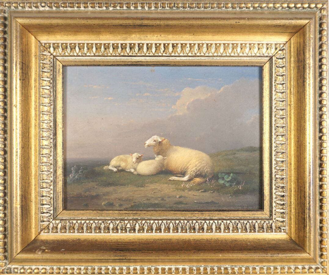 Frans VAN SEVERDONCKE (1809-1889), "Brebis et ses agneaux", huile sur panneau signée en bas à droite, 16 x 21 cm.
