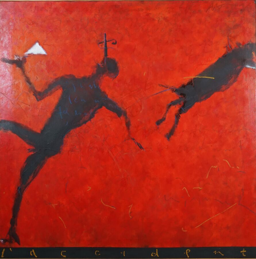 Franyo AATHOH (XXe), "L'accident", huile sur toile signée et datée 96 en haut à droite, titrée en bas, contresigné et daté au dos, 120 x 120 cm.