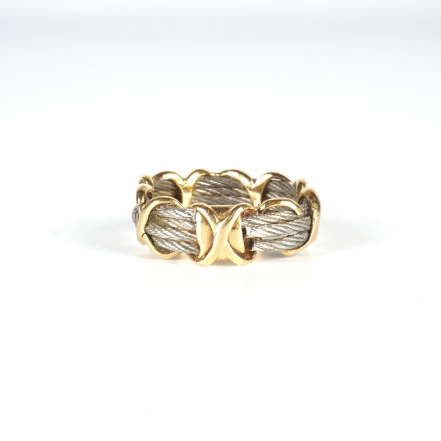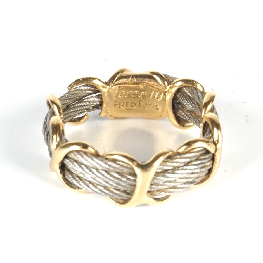 FRED PARIS : Bague modèle "Force 10" en or jaune 18K (750/oo) et câbles d'acier formant quatre lignes serties de liens entrecroisés, signée, TDD. 57. Larg. 7 mm. Poids brut : 5.5 g environ (accidentée).