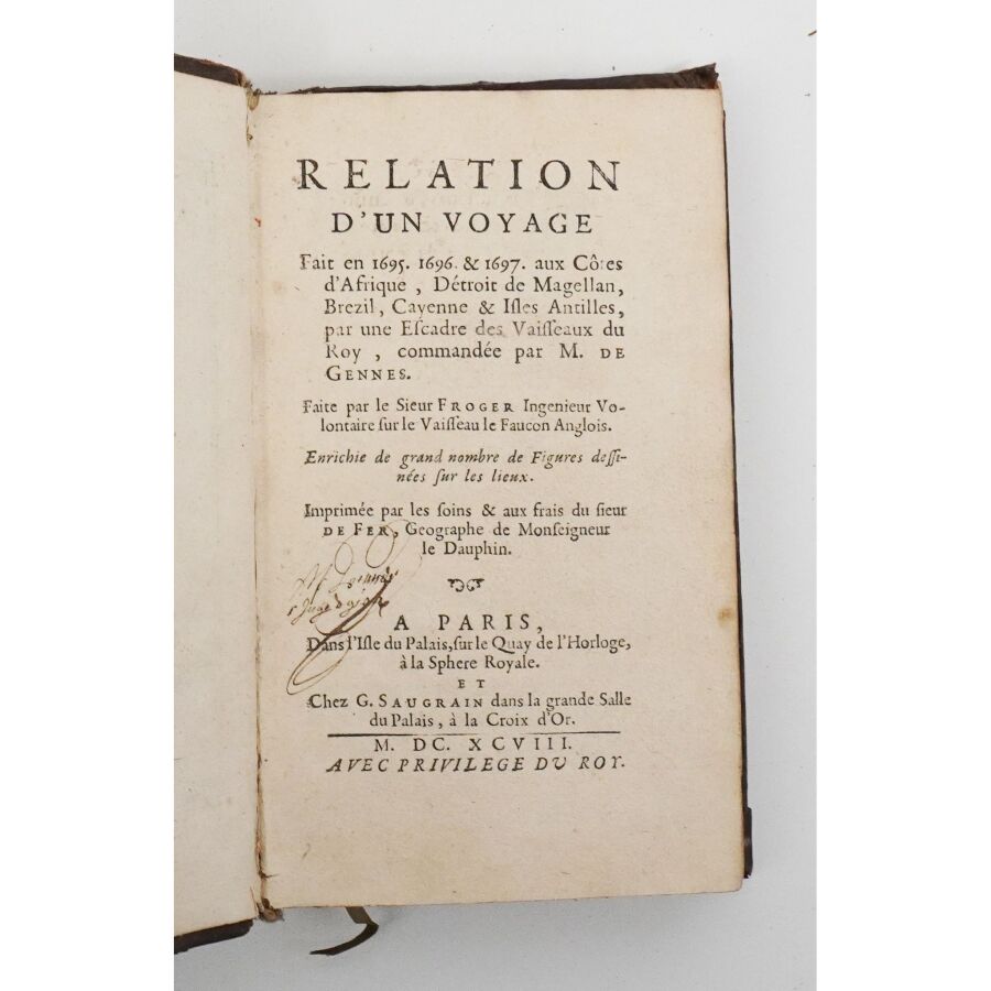FROGER (François). Relation d'un voyage fait en 1695, 1696 et 1697 aux Côtes d'Afrique, Détroit de Magellan, Brezil, Cayenne et Isles Antilles, par une escadre des vaisseaux du Roy, commandée par M. de Gennes. Paris, dans l'Isle du Palais, G. Saugrain, 1698. Grand in-12, veau brun, dos à nerfs orné (reliure de l'époque). Reliure usagée avec manques de cuir.