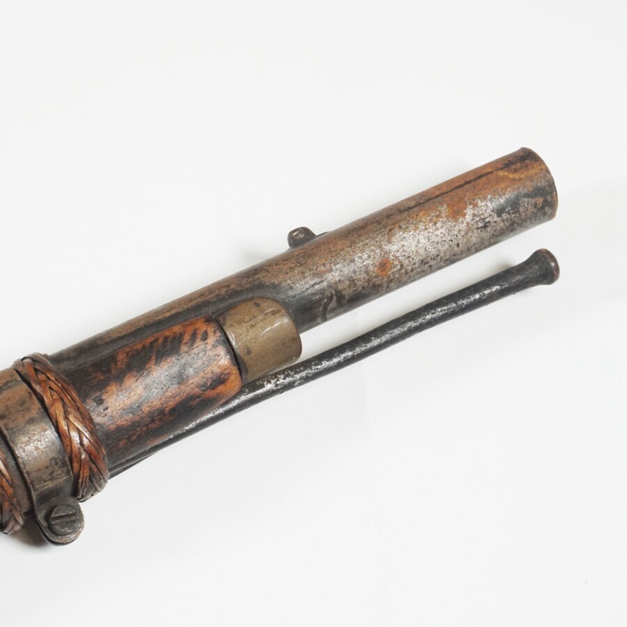 FUSIL ANGLAIS A SILEX GENRE TRAITE, platine à silex avec restants de marquages, canon rond de 78 cm, garnitures en fer et en laiton, bracelets tressés, crosse en bois, baguette en fer, longueur : 120 cm, DANS L'ETAT.