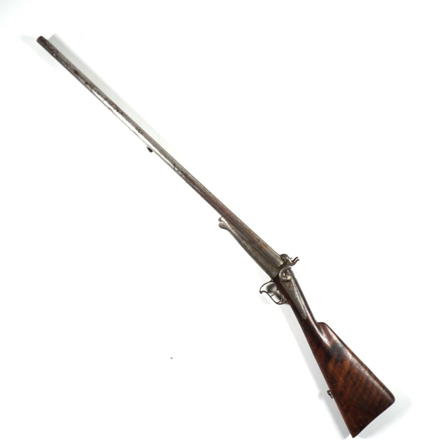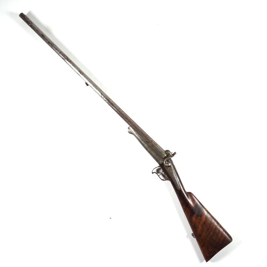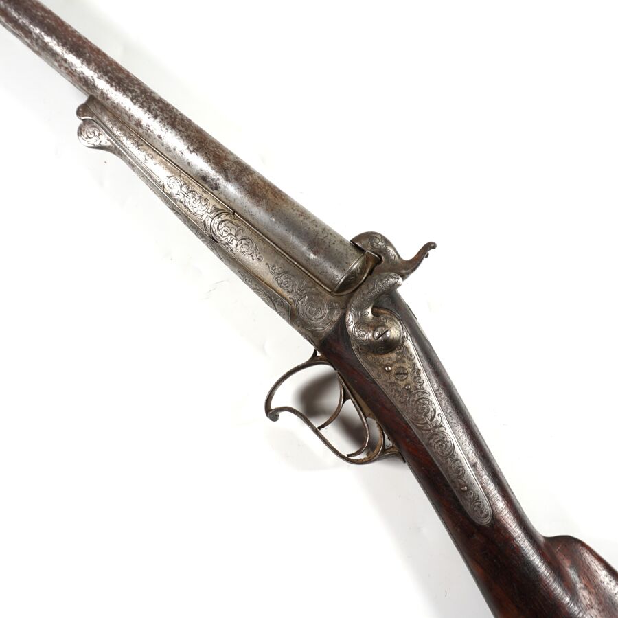 FUSIL DE CHASSE A BROCHE, calibre 16/65 à canons piqués juxtaposés de 76 cm, ruban marqué " Brun à Paris ", modèle sans extracteurs, platines arrières à décor gravé de rinceaux feuillagés marquées " BRUN A PARIS ", garnitures gravées en suite, crosse anglaise en noyer, mécanisme semblant fonctionnel, longueur totale : 115 cm, vers 1870, BE.