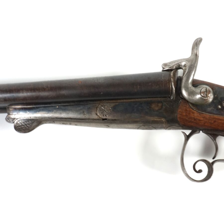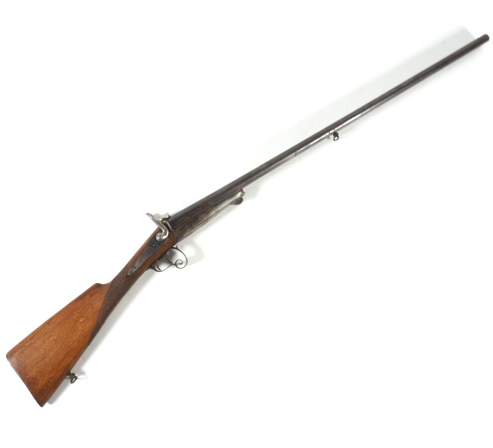 FUSIL DE CHASSE A BROCHE DE FABRICATION STEPHANOISE, calibre 20 à canons juxtaposés de 78 cm, sans extracteur, platines arrières anciennement jaspées, clé d'ouverture type Lefaucheux, pontet à volute, crosse anglaise en noyer d'environ 36 cm en partie quadrillée, mécanisme non fonctionnel (mécanisme d'un chien à revoir), canons propres, longueur totale : 118 cm, seconde moitié XIXème, BE.