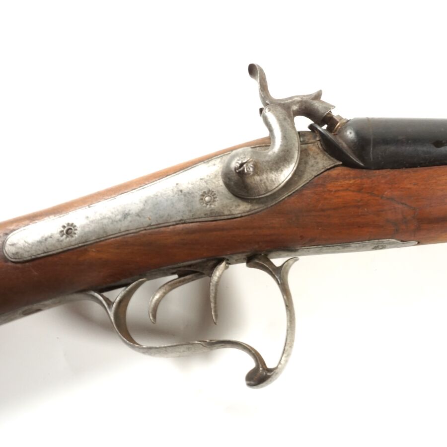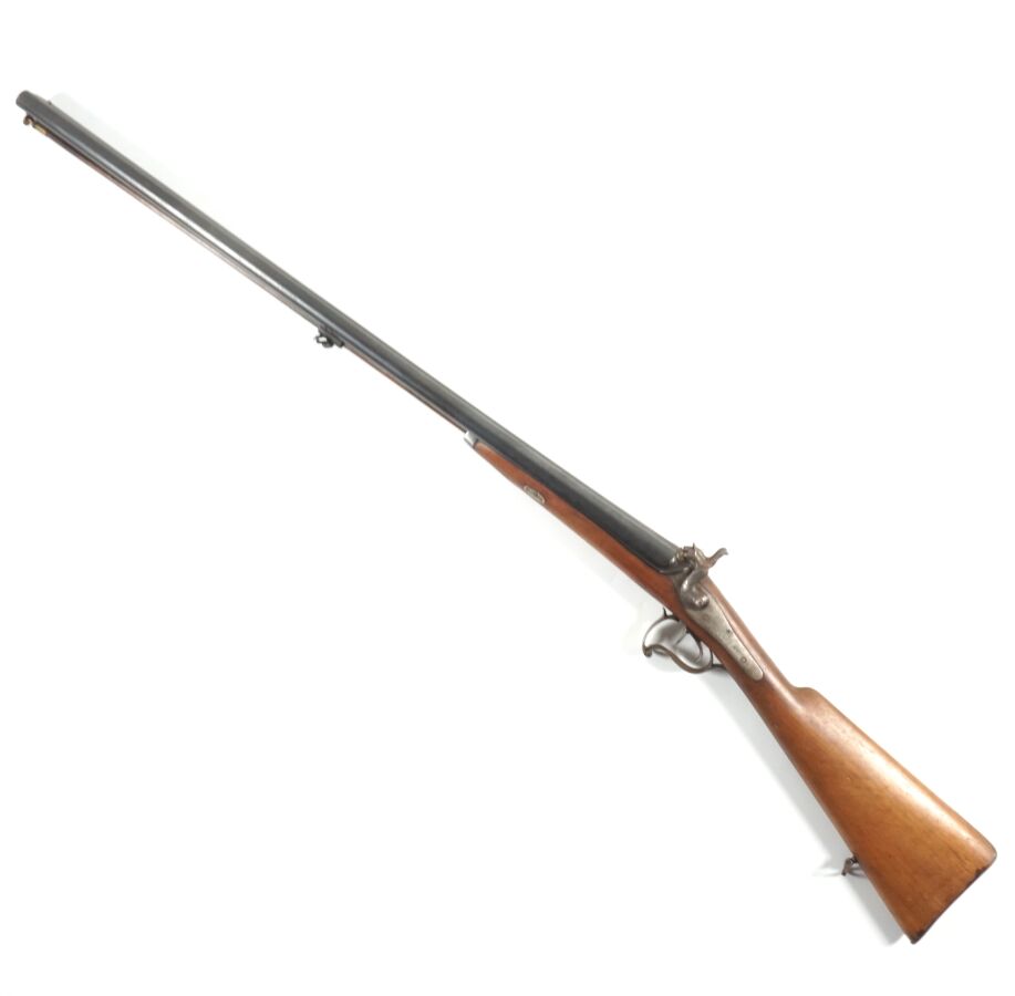 FUSIL DE CHASSE A PERCUSSION A CHIENS EXTERIEURS, calibre 16 à canons juxtaposés de 75.5 cm (rebronzés), platines arrières, pontet à volute, crosse anglaise en noyer d'environ 35.5 cm, plaque de couche piquée, baguette en bois à embout laiton, mécanisme semblant fonctionnel, canons piqués, longueur totale : 117 cm, fin XIXème, ABE.