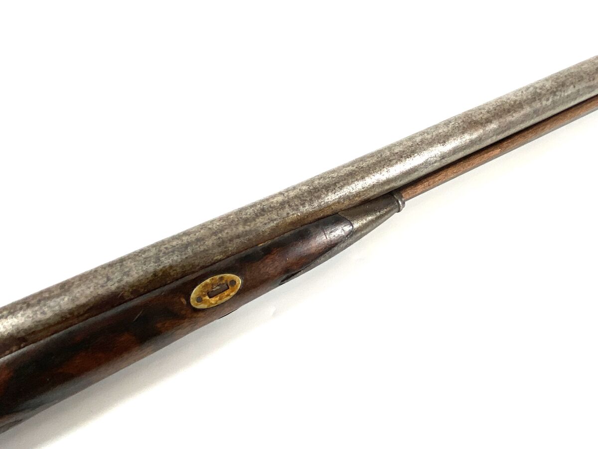FUSIL DE CHASSE A PERCUSSION A CHIENS EXTERIEURS, calibre 17 à canons juxtaposés de 81.5 cm, sans extracteur, platines arrières et chiens à corps plats, crosse anglaise en noyer d'environ 34 cm en partie quadrillée et sculpté à pli et à décor d'un homme stylisé et de rosace, busc, accidents et manques, baguette en bois, mécanisme à revoir, toutes parties métalliques piquées, canons piqués et usés, longueur totale : 124.5 cm, fin XIXème, EM.