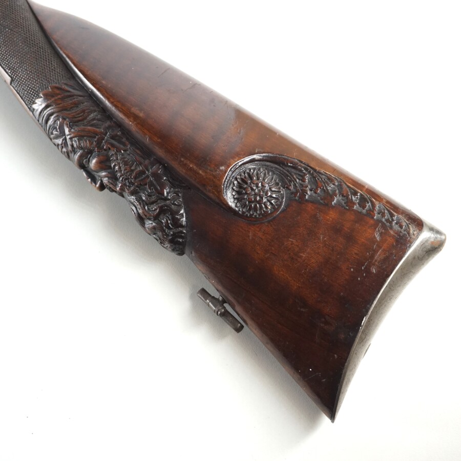 FUSIL DE CHASSE A PERCUSSION A DEUX CANONS EN TABLE, platines à percussion et chiens à corps plats, canons de 82 cm, garnitures en fer, baguette en bois sans embout, belle crosse à plis en noyer sculpté à décor d'une tête de vieillard et en partie finement quadrillée, mécanisme semblant fonctionnel, longueur : 124 cm, milieu XIXème, ABE.