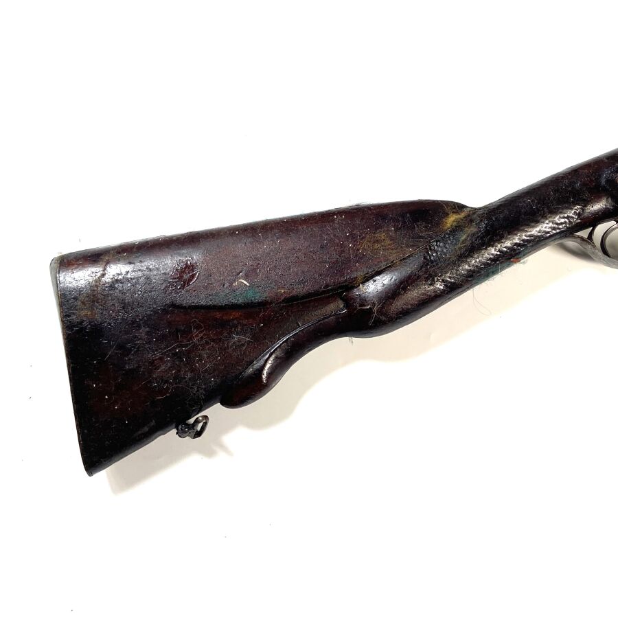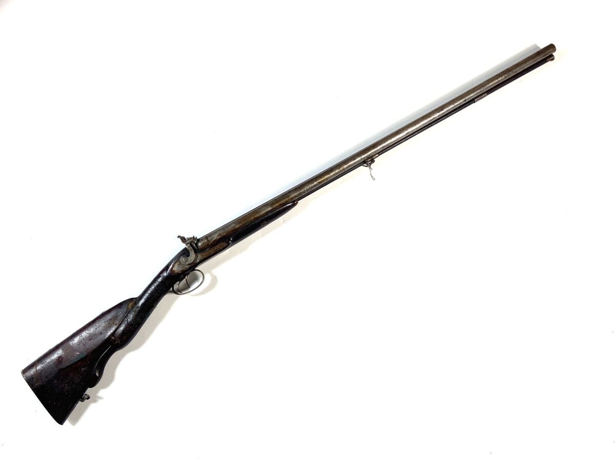 FUSIL DE CHASSE A PERCUSSION A DEUX CANONS EN TABLE, platines marquées " BOULPIQUIANTE à SAINT-ETIENNE " et chiens à corps plats, canons ruban de 84,5 cm, crosse à pli en bois à décor sculpté d'un bec de canard et d'une rosace, baguette en bois à embout en laiton, mécanisme semblant fonctionnel, longueur totale : 126 cm, à nettoyer, fin XIXème, EM.