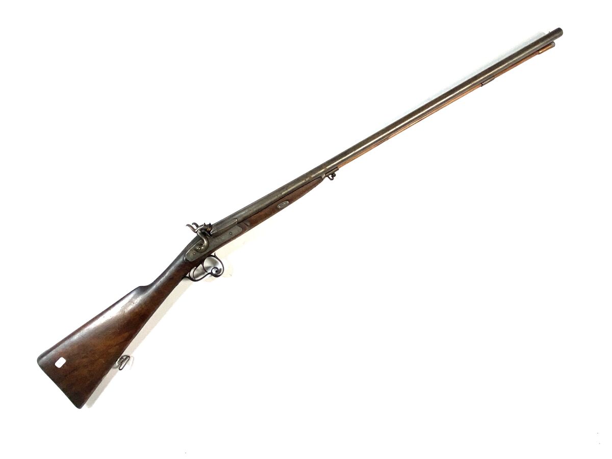 FUSIL DE CHASSE A PERCUSSION A DEUX CANONS EN TABLE, platines à percussion, canons juxtaposés de 79 cm, ruban marqué " Damas moiré ", pontet à volute, crosse anglaise en noyer (trous de vers et fentes), baguette en bois à embout en laiton et plomb, mécanisme semblant fonctionnel, longueur totale : 120 cm, milieu XIXème, ABE.