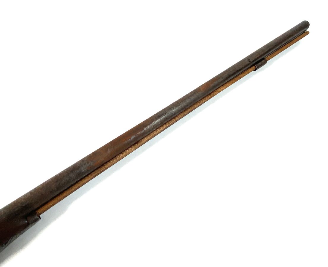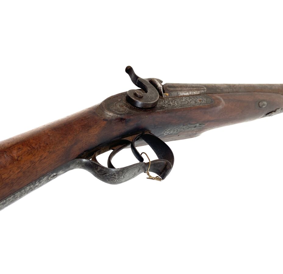 FUSIL DE CHASSE A PERCUSSION A DEUX CANONS EN TABLE, platines et chiens à corps plats à décor gravé de rinceaux feuillagés, canons juxtaposés de 83 cm, pontet à volute, crosse en noyer, baguette en bois, mécanisme semblant fonctionnel, longueur totale : 123,5 cm, milieu XIXème, ABE.