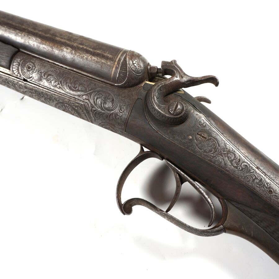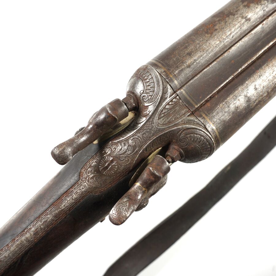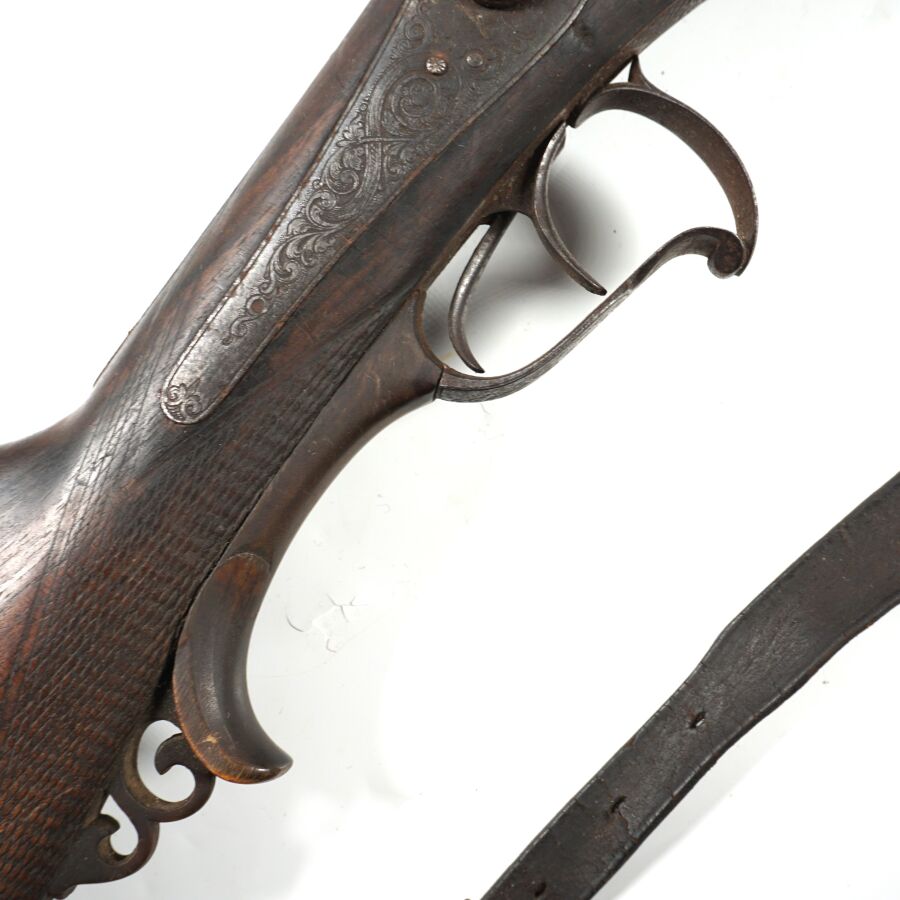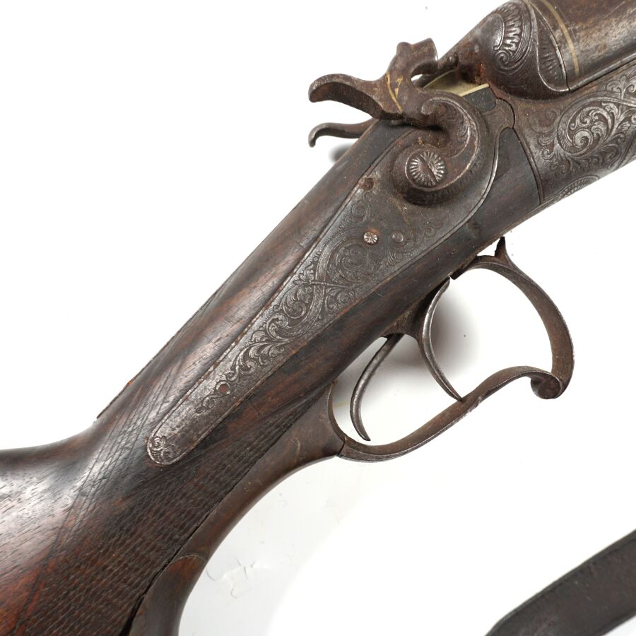 FUSIL DE CHASSE A PERCUSSION ET A CHIENS EXTERIEURS, calibre 12/65 à canons juxtaposés piqués de 75 cm, extracteurs, platines arrières à décor gravé de rinceaux feuillagés, pontet avec repose-doigts en corne brune, crosse anglaise en noyer en partie quadrillée, bretelle en cuir, mécanisme semblant fonctionnel, longueur totale : 115 cm, vers 1880, ABE.