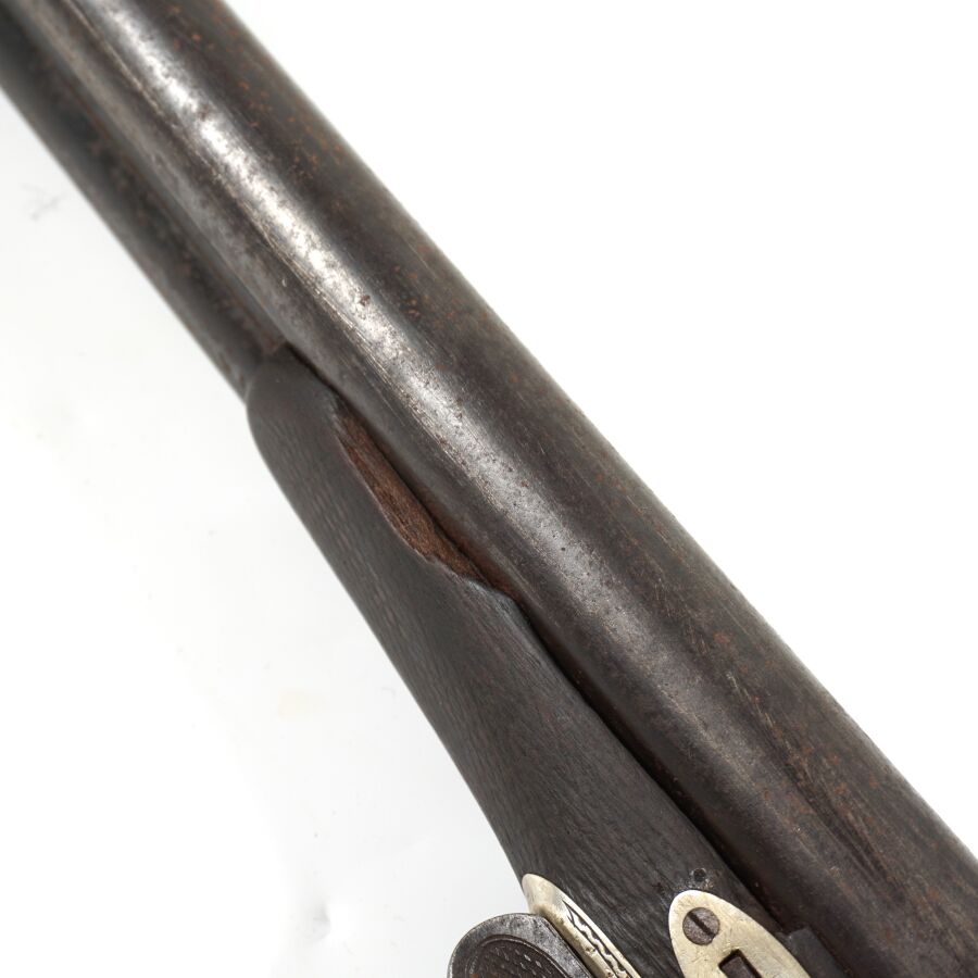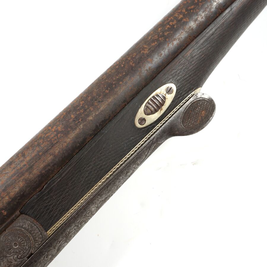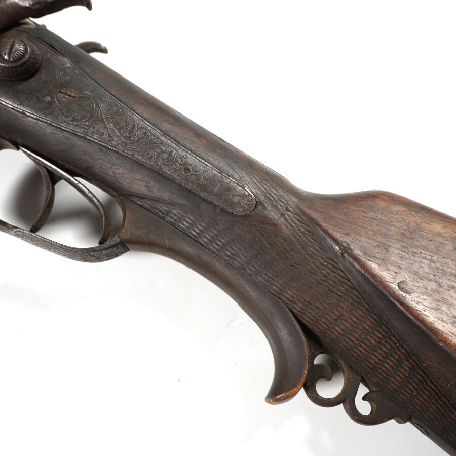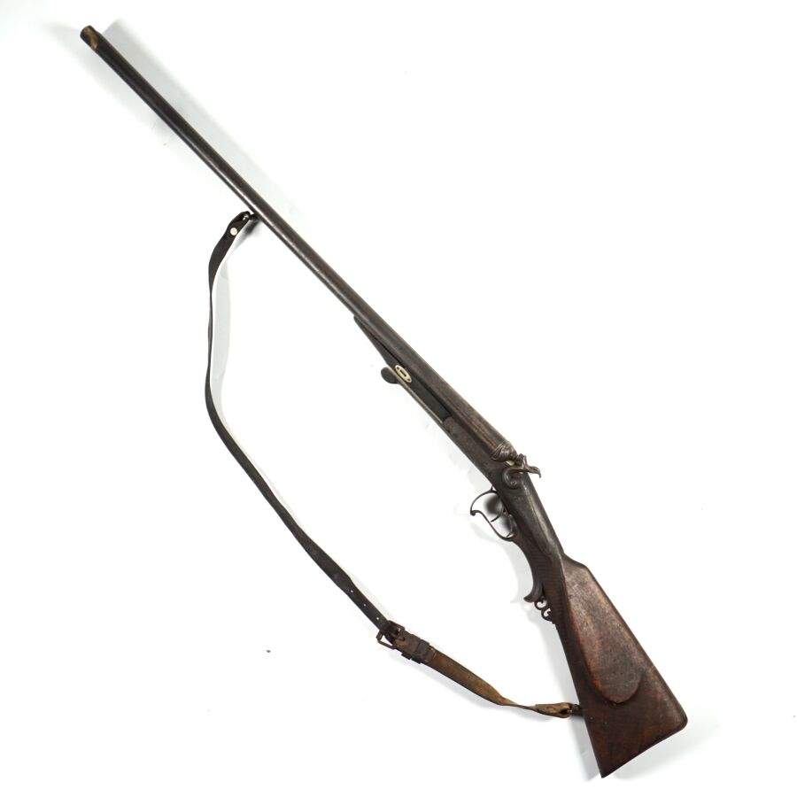 FUSIL DE CHASSE A PERCUSSION ET A CHIENS EXTERIEURS, calibre 12/65 à canons juxtaposés piqués de 75 cm, extracteurs, platines arrières à décor gravé de rinceaux feuillagés, pontet avec repose-doigts en corne brune, crosse anglaise en noyer en partie quadrillée, bretelle en cuir, mécanisme semblant fonctionnel, longueur totale : 115 cm, vers 1880, ABE.