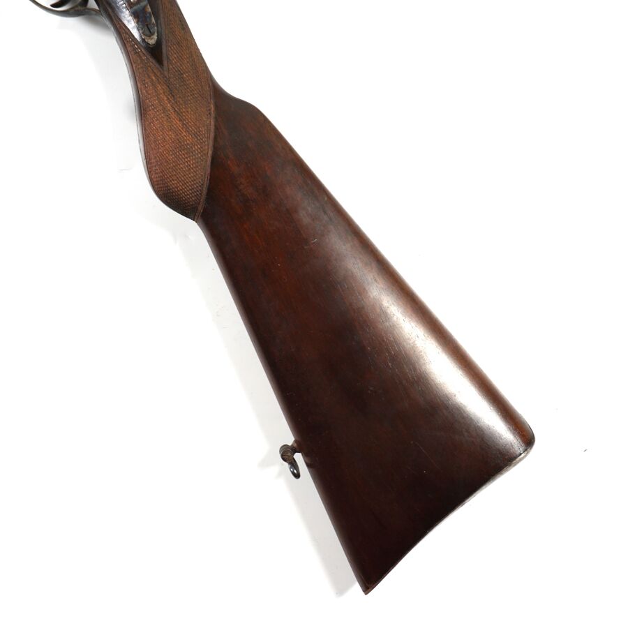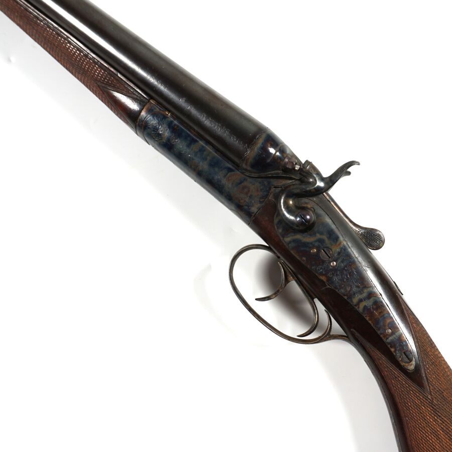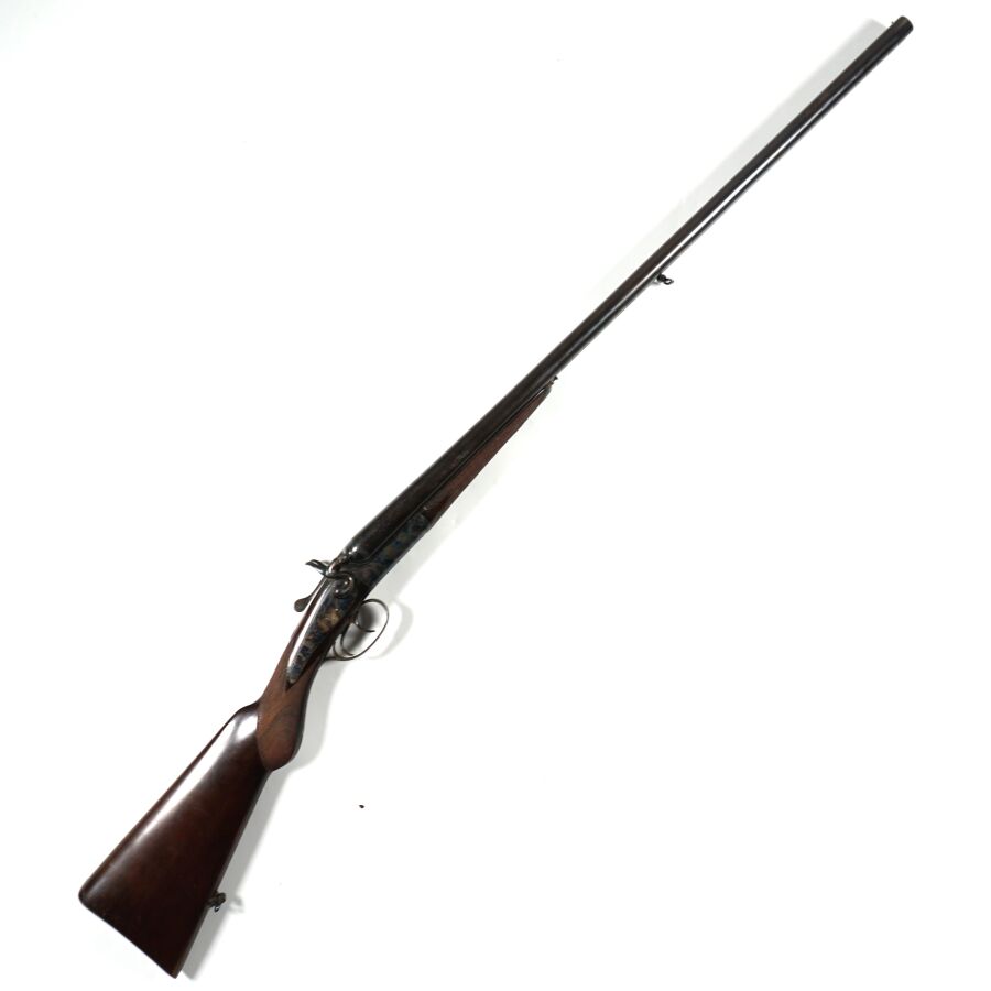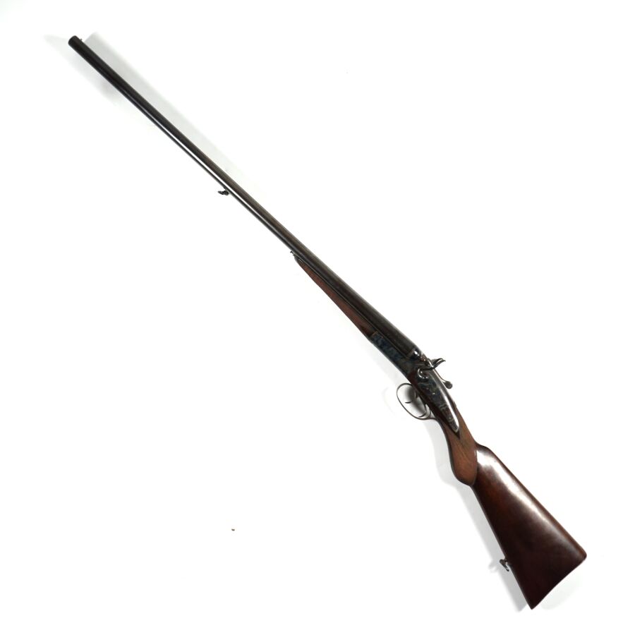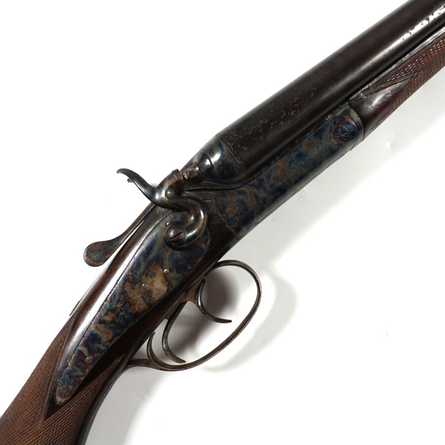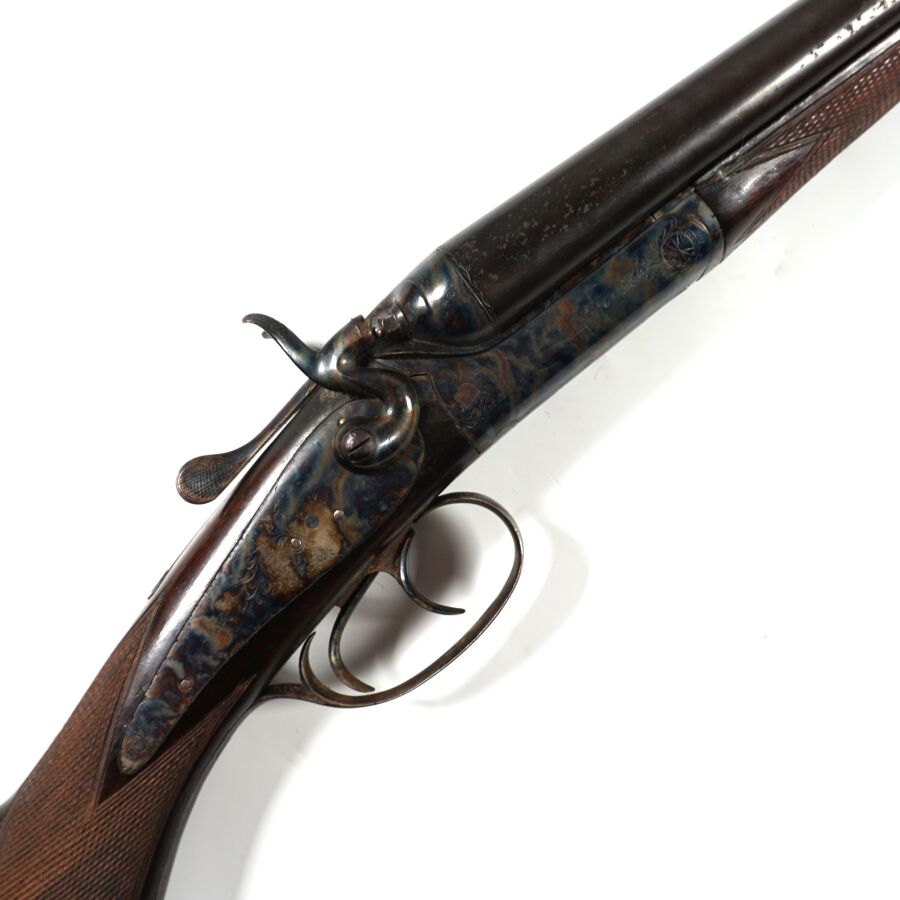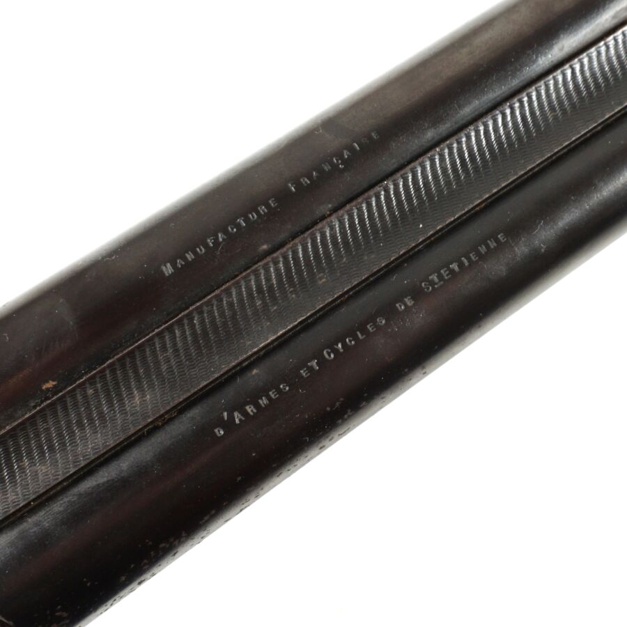 FUSIL DE CHASSE A PERCUSSION ET A CHIENS EXTERIEURS DE LA MANUFACTURE FRANCAISE D'ARMES ET CYCLES SAINT-ETIENNE, calibre 16/70 à canons juxtaposés de 73.5 cm, extracteurs, bascule jaspée à décor gravé de rinceaux feuillagés, clé d'ouverture top lever, crosse demi-pistolet en noyer de 36 cm en partie quadrillée, arme numéro 12295, catégorie C soumise à déclaration, mécanisme semblant fonctionnel, canons propres, longueur totale : BE/TBE.