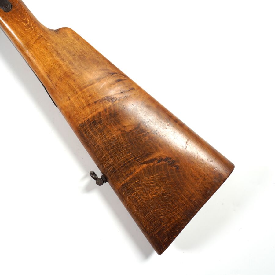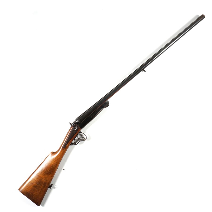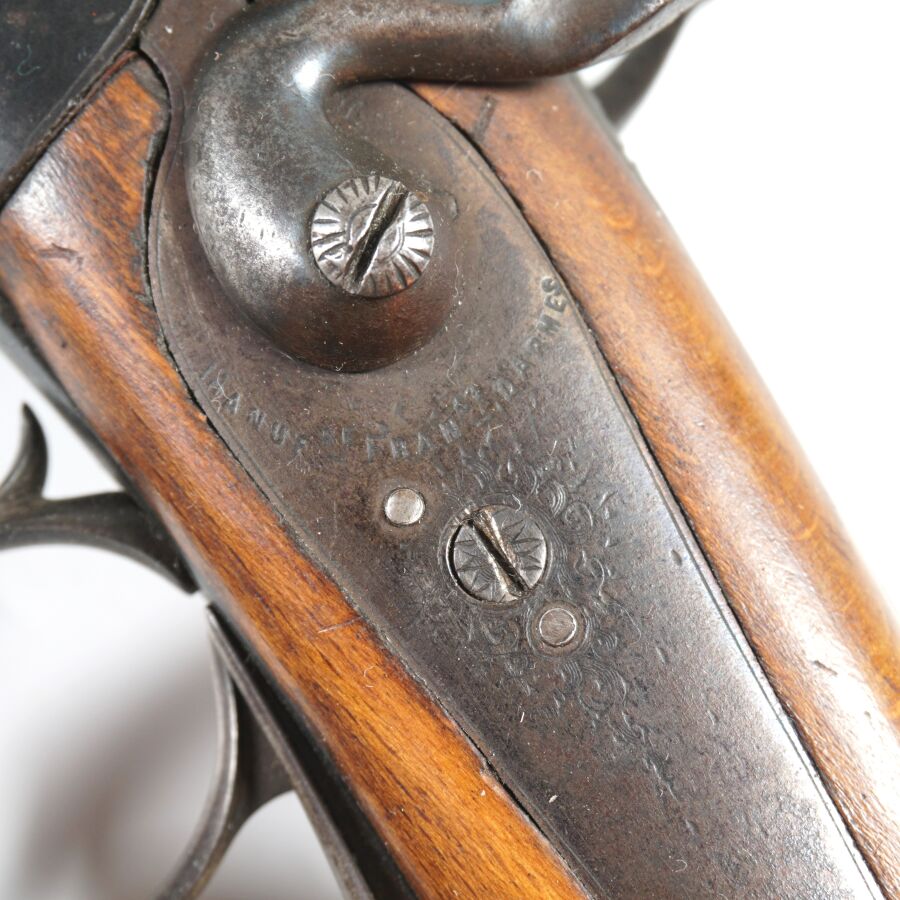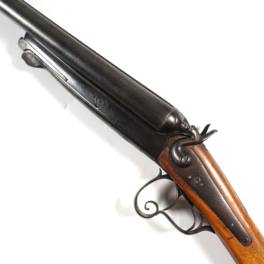 FUSIL DE CHASSE A PERCUSSION ET A CHIENS EXTERIEURS DE LA MANUFACTURE FRANCAISE D'ARMES ET CYCLES SAINT-ETIENNE, calibre 16 à canons juxtaposés rubanés de 74 cm (altérations du bronzage à la bouche des canons), extracteur, clé d'ouverture type Lefaucheux, pontet à volute, crosse anglaise en noyer d'environ 35.5 cm, dépourvue de plaque de couche, mécanisme semblant fonctionnel, canons légèrement piqués, longueur totale : 116 cm, fin XIXème, BE.