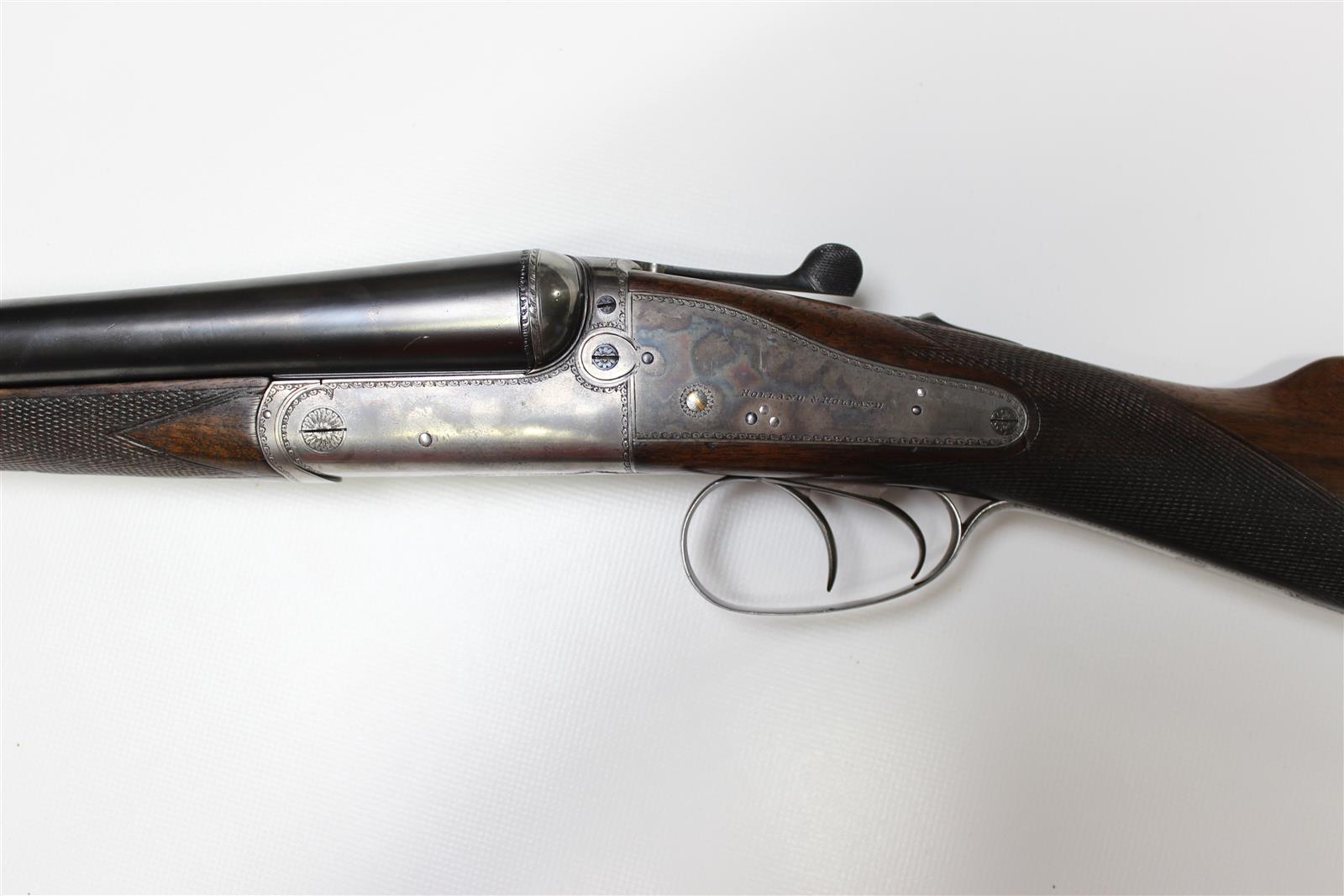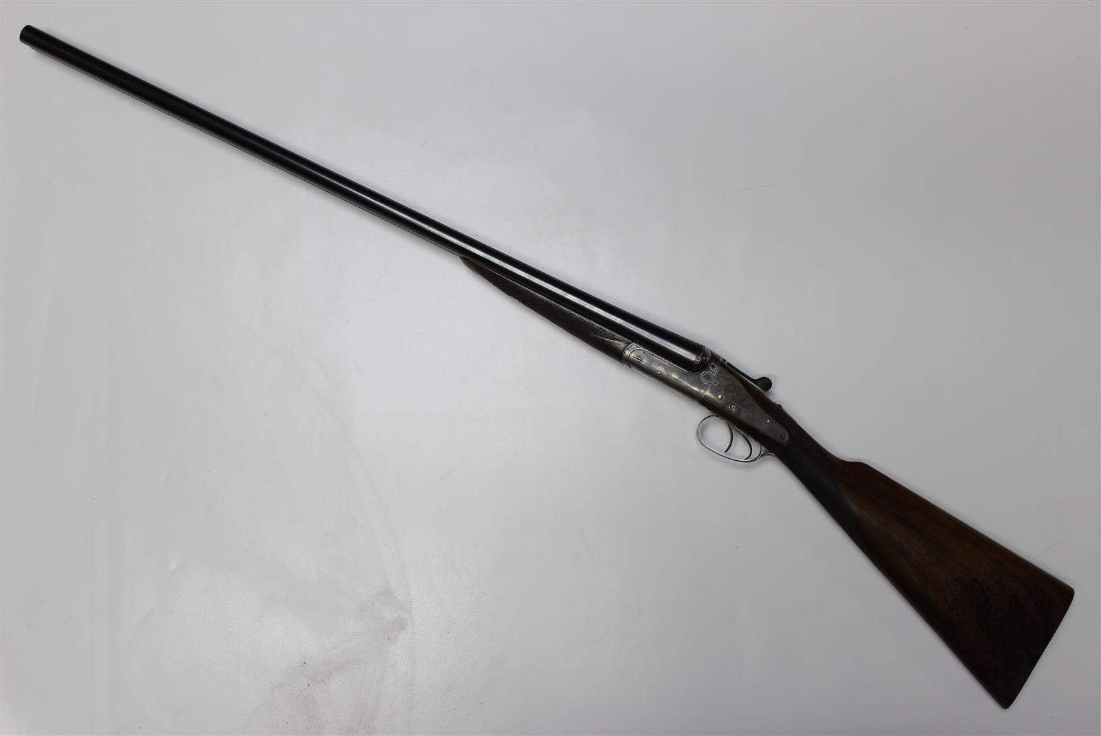 FUSIL DE CHASSE A PLATINES DE MARQUE HOLLAND ET HOLLAND, calibre 12/70 à canons juxtaposés de 76 cm, extracteur, platines marquées " HOLLAND & HOLLAND ", canons marqués " HOLLAND & HOLLAND " et " 98 NEW BOND STREET LONDON ", crosse anglaise en noyer en partie quadrillée chiffrée " P.L. ", arme numéro 026207, catégorie D1 soumise à enregistrement, mécanisme et canons en bon état, BE.