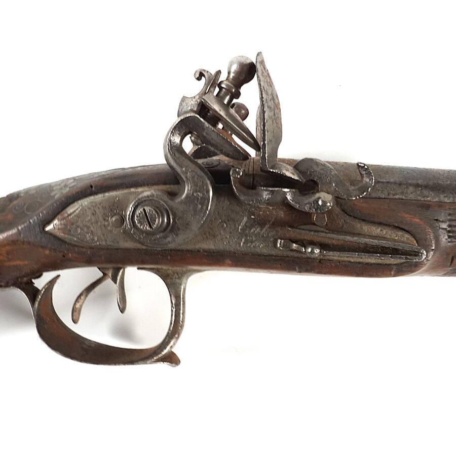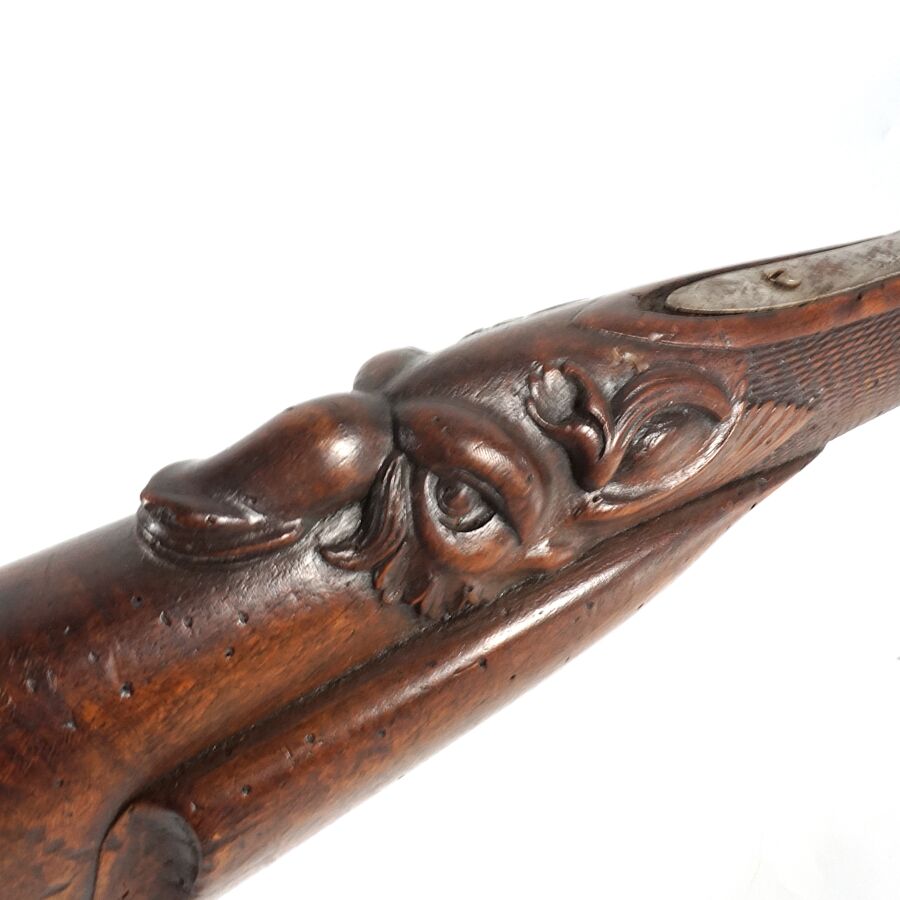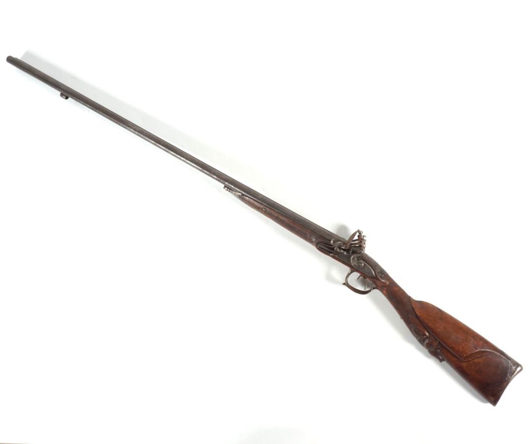 FUSIL DE CHASSE A SILEX A DEUX CANONS EN TABLE, calibre 20, canon rond de 87 cm, platines et chiens à corps plat, marquages sur les platines illisibles, large pontet surmonté d'un écusson, crosse à pli d'environ 35.5 cm en noyer en partie quadrillée à décor sculpté d'un mammifère terrestre stylisé, filés métalliques incrustés et appuie joue en mauvais état (importantes fissures à la poignée et au fût), plaque de couche piquée, manque la baguette, mécanisme semblant fonctionnel, canons piqués et usés, longueur totale : 127.5 cm, fin XVIIIème, EM/ABE.