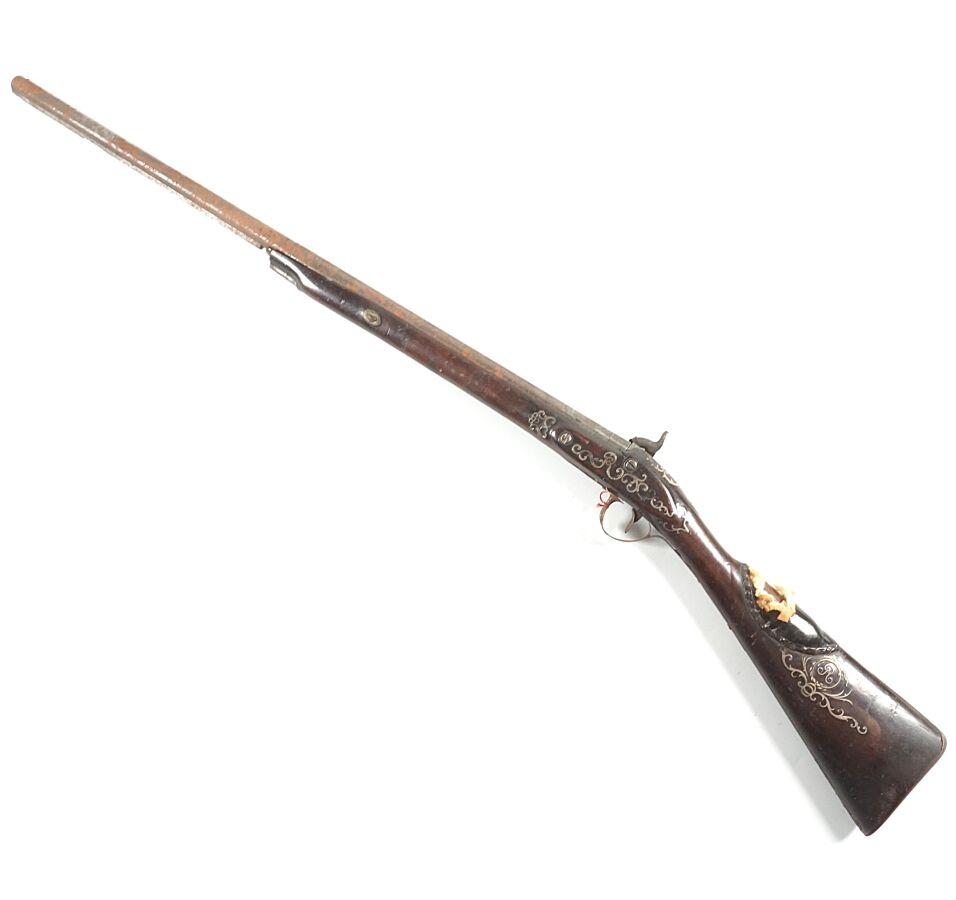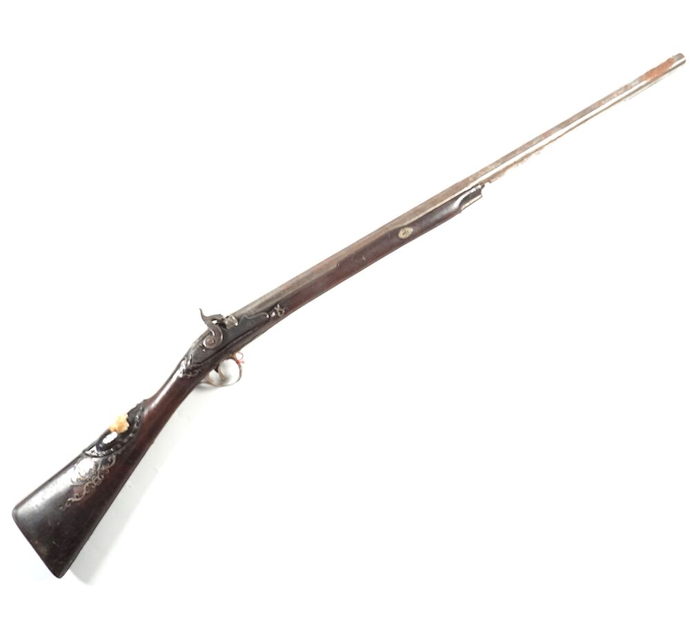 FUSIL DE CHASSE A SILEX TRANSFORME A PERCUSSION, platine et chien à corps plats, canon piqué à pans puis ronds de 76 cm, rail sous la seconde partie du canon, garniture en fer, large pontet, monture en noyer à décor d'incrustations de filets métalliques et monogrammée " RM ", appuie joue en cuir clouté (accident), baguette manquante, mécanisme non fonctionnel, longueur totale : 115 cm, EM/DANS L'ETAT.