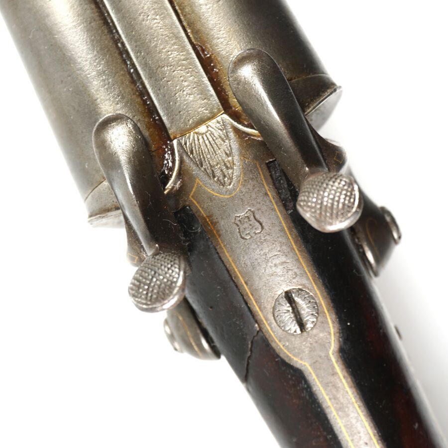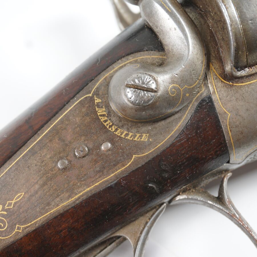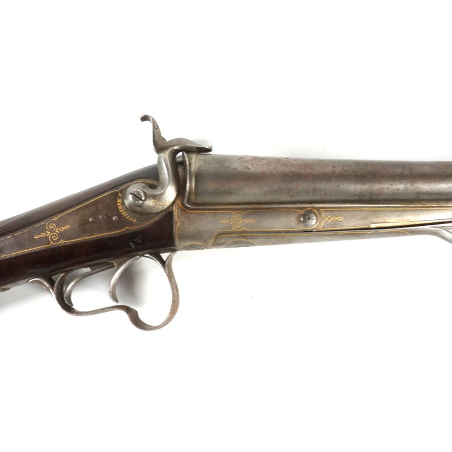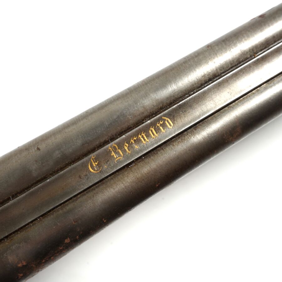 FUSIL DE CHASSE LIEGEOIS A BROCHE, calibre 12/65 à canons juxtaposés piqués de 74.5 cm en damas éclair (enfoncement), platines arrières et garnitures en acier à décor d'un liseré doré, platines marquées " BERNARD & FRANZETTI, A MARSEILLE ", clé d'ouverture sous pontet, crosse anglaise de 35.5cm en noyer choisi en partie quadrillée (coups et griffures, accident et manque au bec de crosse), mécanisme semblant fonctionnel, canons piqués, longueur totale : 115 cm, ABE.