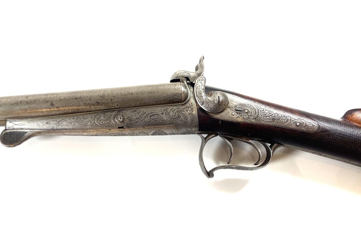 FUSIL DE CHASSE LIEGEOIS A BROCHE, calibre 20/65 à canons juxtaposés de 76 cm, extracteurs, platines arrières, chiens et garnitures en acier gravés de rinceaux feuillagés, clé d'ouverture devant pontet, crosse anglaise en noyer en partie quadrillée (coups), mécanisme semblant fonctionnel, canons propres, longueur totale : 116 cm, seconde moitié XIXème, BE.
