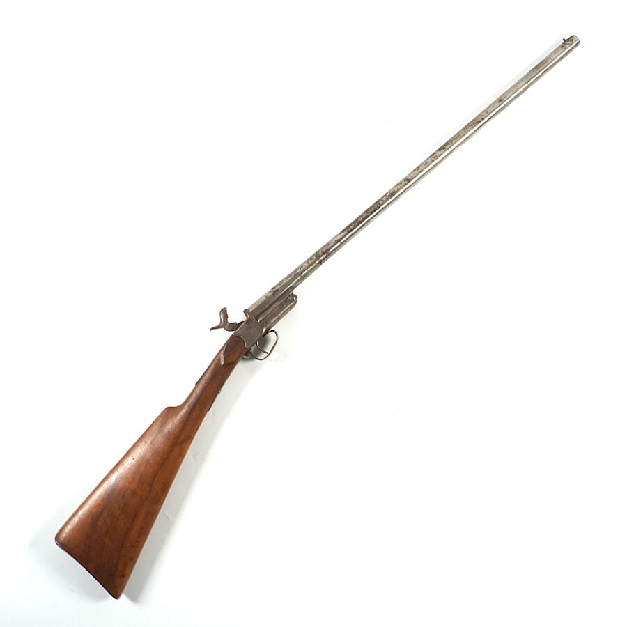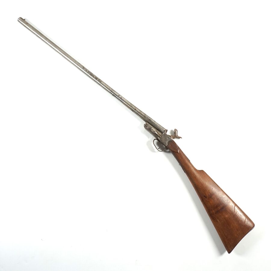FUSIL DE CHASSE PLIANT DE BRACONNIER A BROCHE DE FABRICATION PROBABLEMENT STEPHANOISE, calibre 28, canon rond de 60.5 cm à méplat au tonnerre, sans extracteur, platine à coffre à décor gravé de rinceaux, ouverture par poussoir sous canon, fine crosse anglaise en noyer d'environ 35.5 cm, mécanisme non fonctionnel (revoir mécanisme du chien extérieur, vis manquantes et jeu au canon), canon piqué à nettoyer, longueur totale : 98.5 cm, DANS L'ETAT.