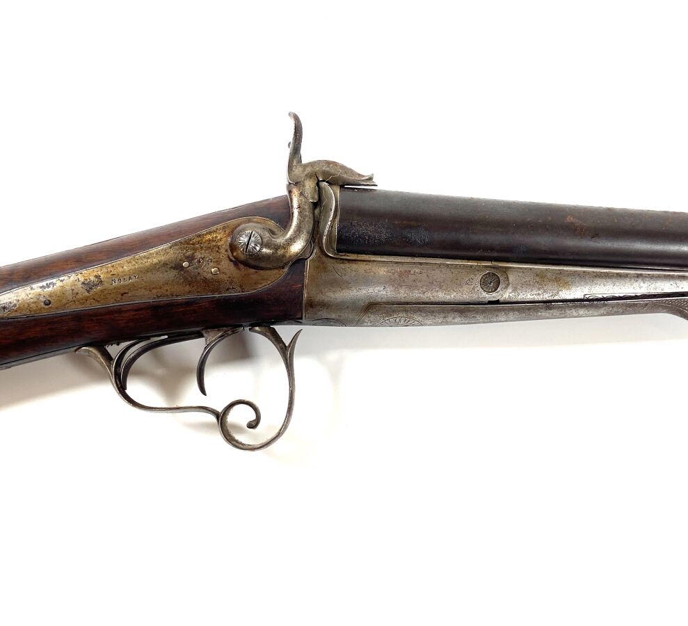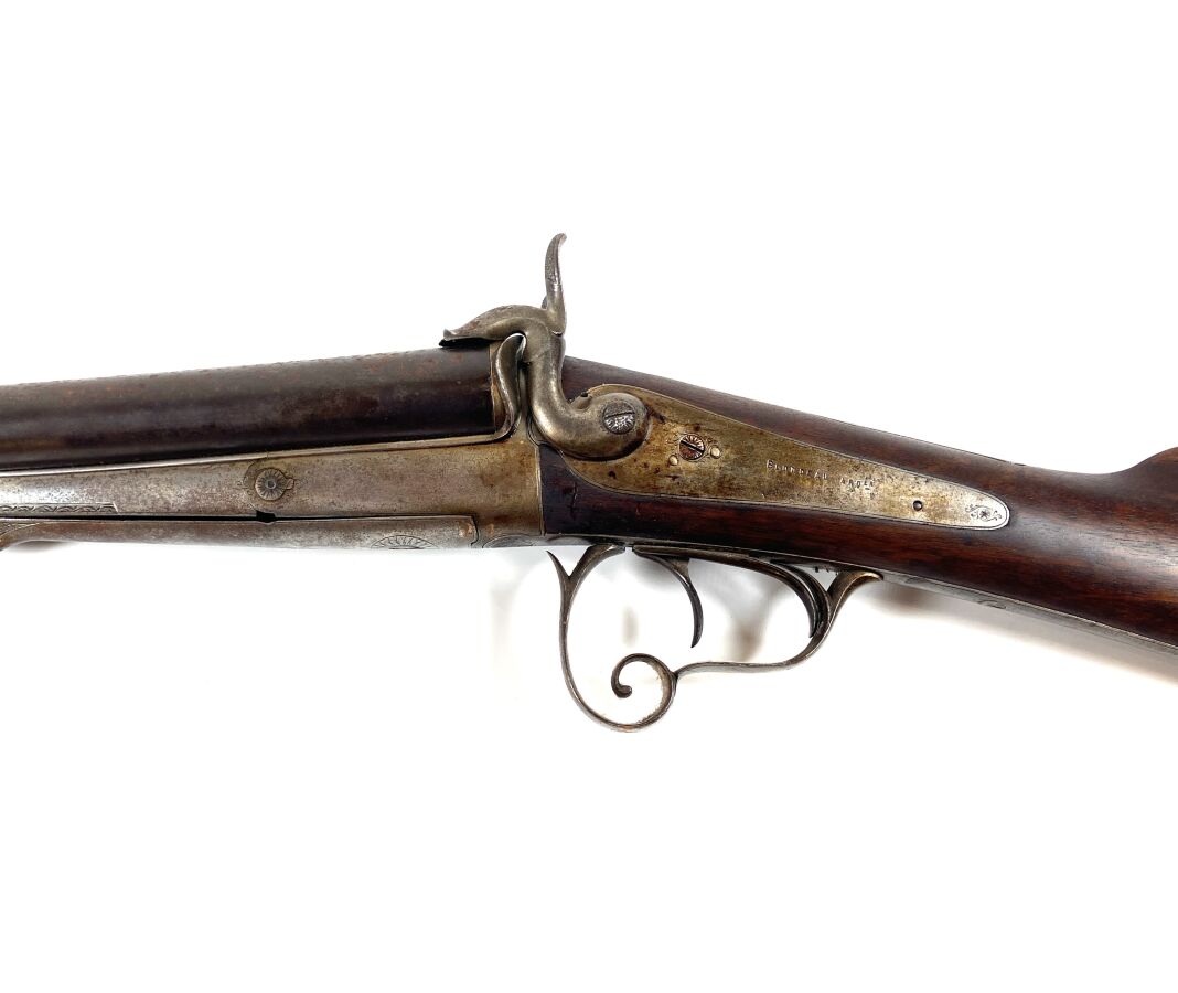 FUSIL DE CHASSE STEPHANOIS A BROCHE, calibre 16/65 à canons juxtaposés de 75 cm, extracteurs, platines arrières marquée " BLONDEAU à NOLAY ", clé d'ouverture devant pontet, crosse anglaise en noyer, mécanisme semblant fonctionnel, canons à nettoyer et légèrement piqués à l'extérieur, longueur totale : 115,5 cm, seconde moitié XIXème, ABE.