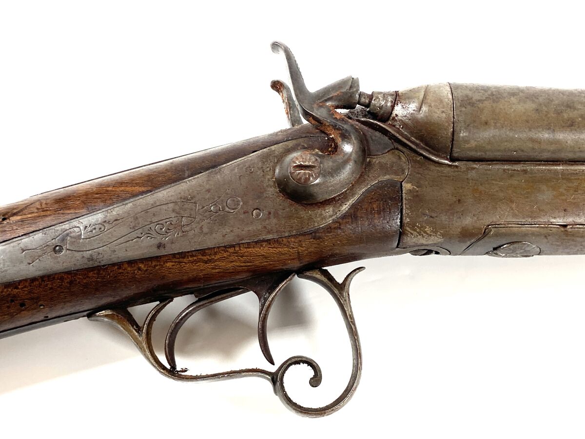 FUSIL DE CHASSE STEPHANOIS A PERCUSSION A CHIENS EXTERIEURS ET A DEUX CANONS EN TABLE, calibre 24 à canons juxtaposés de 66,5 cm, extracteurs, platines arrières à cartouches non gravés, levier d'ouverture sous garde, crosse anglaise en noyer en partie quadrillée, longueur totale : 106,5 cm, mécanisme semblant fonctionnel, canons à nettoyer, fin XIXème, ABE.