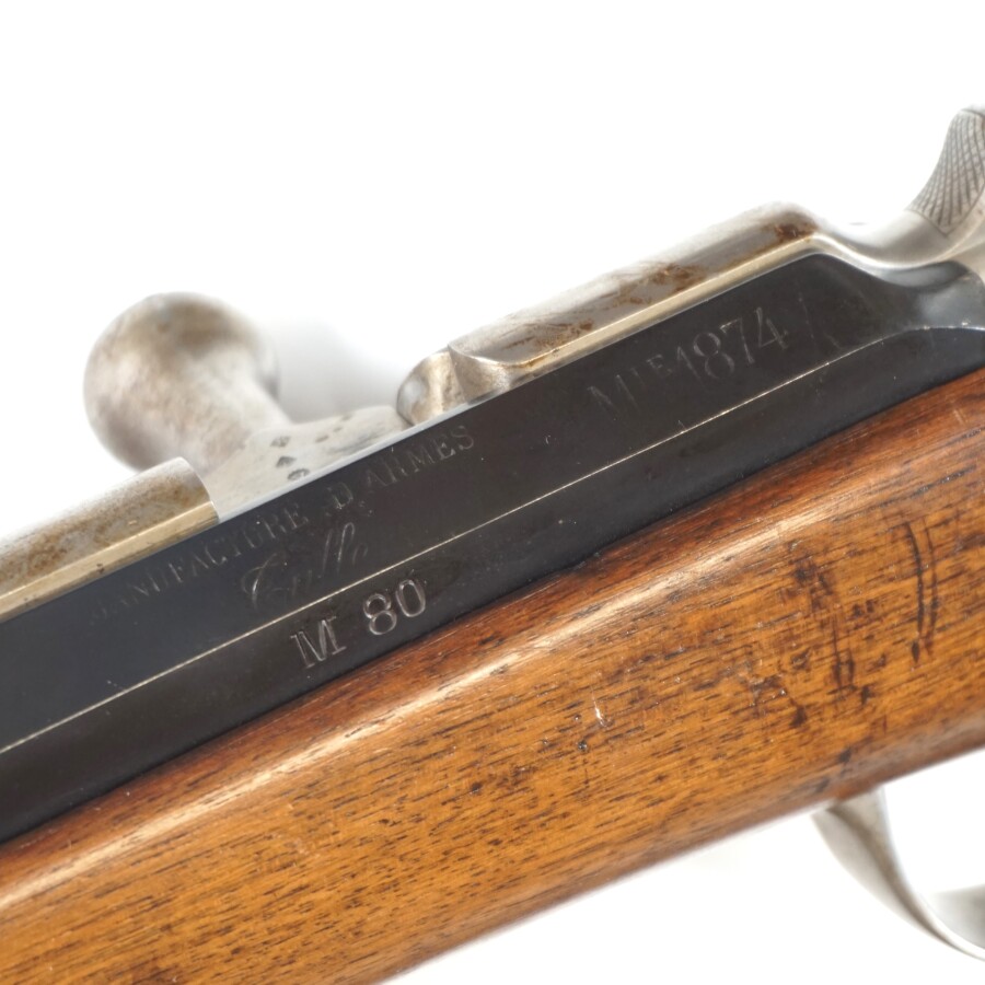 FUSIL D'INFANTERIE GRAS MODELE 1874 M80, calibre 11 mm gras, boitier de culasse marqué " Manufacture d'armes Tulle Mle 74 M80 ", canon rond d'environ 79 cm, à pans au tonnerre marqué " T1883 ", arme numéro (FG78779) hormis notamment la baguette, hausse et plaque de couche…, hausse réglable, garnitures en fer, crosse en noyer avec traces d'usage, baguette en fer, mécanisme semblant fonctionnel, longueur totale : 130 cm, ABE.