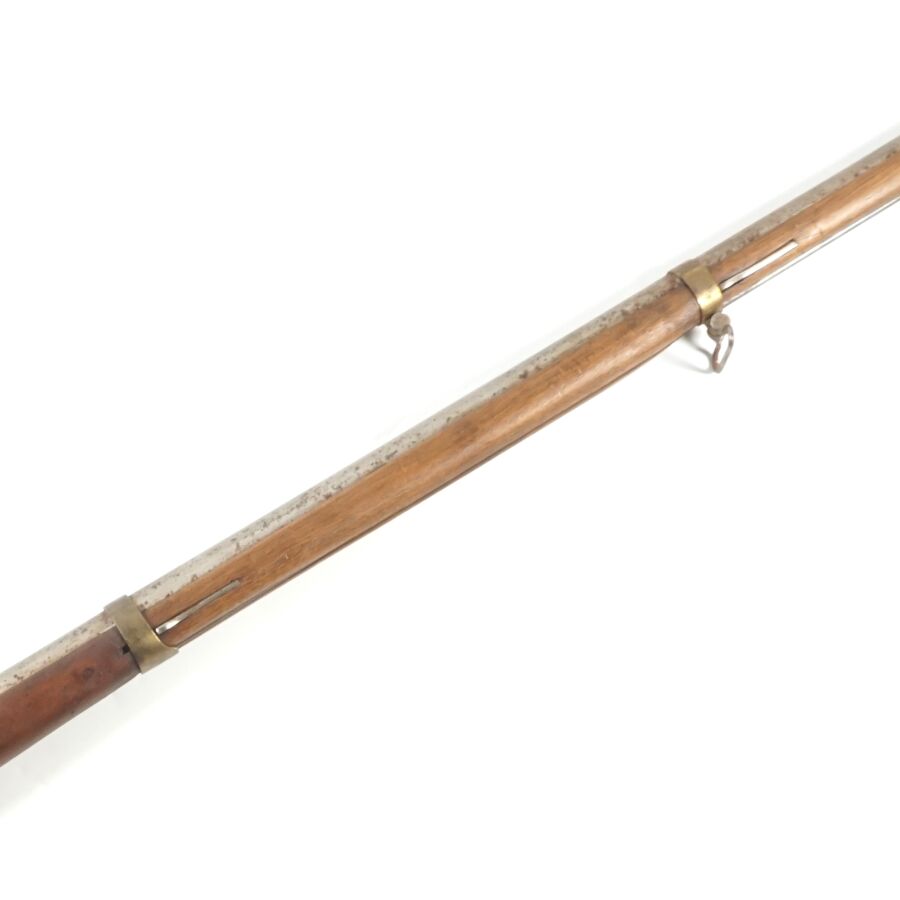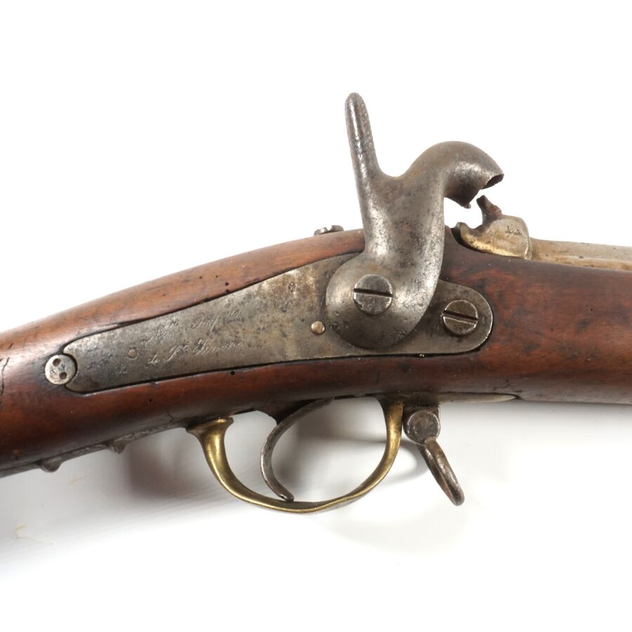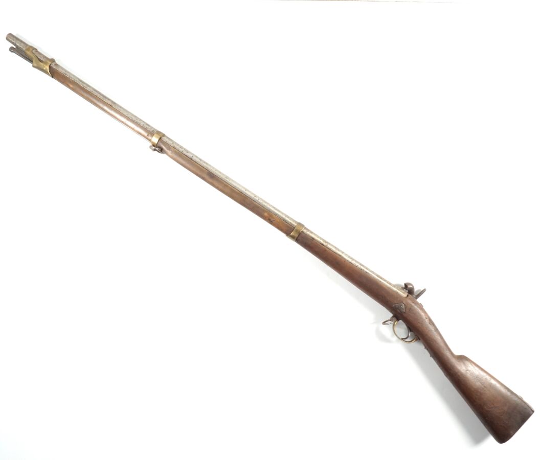 FUSIL GENRE 1842 T, platine arrière à percussion de la " Mre Imple de St-Etienne " (difficilement lisible), manque au chien, canon rond à pans au tonnerre de 115 cm sans marquages, pontet, capucine et grenadière en laiton, baguette en fer, monture en noyer, plaque de couche en fer, mécanisme à revoir, longueur totale : 154 cm, ABE.