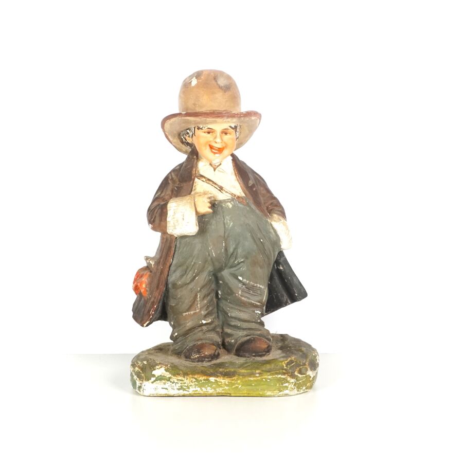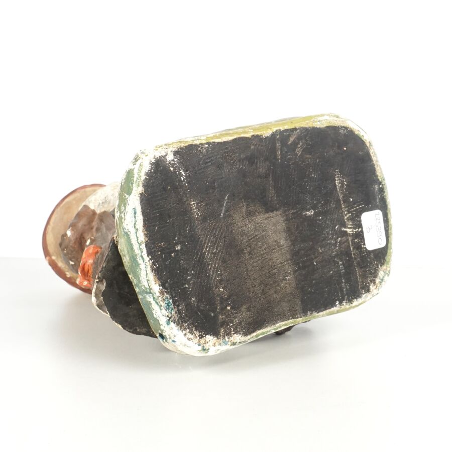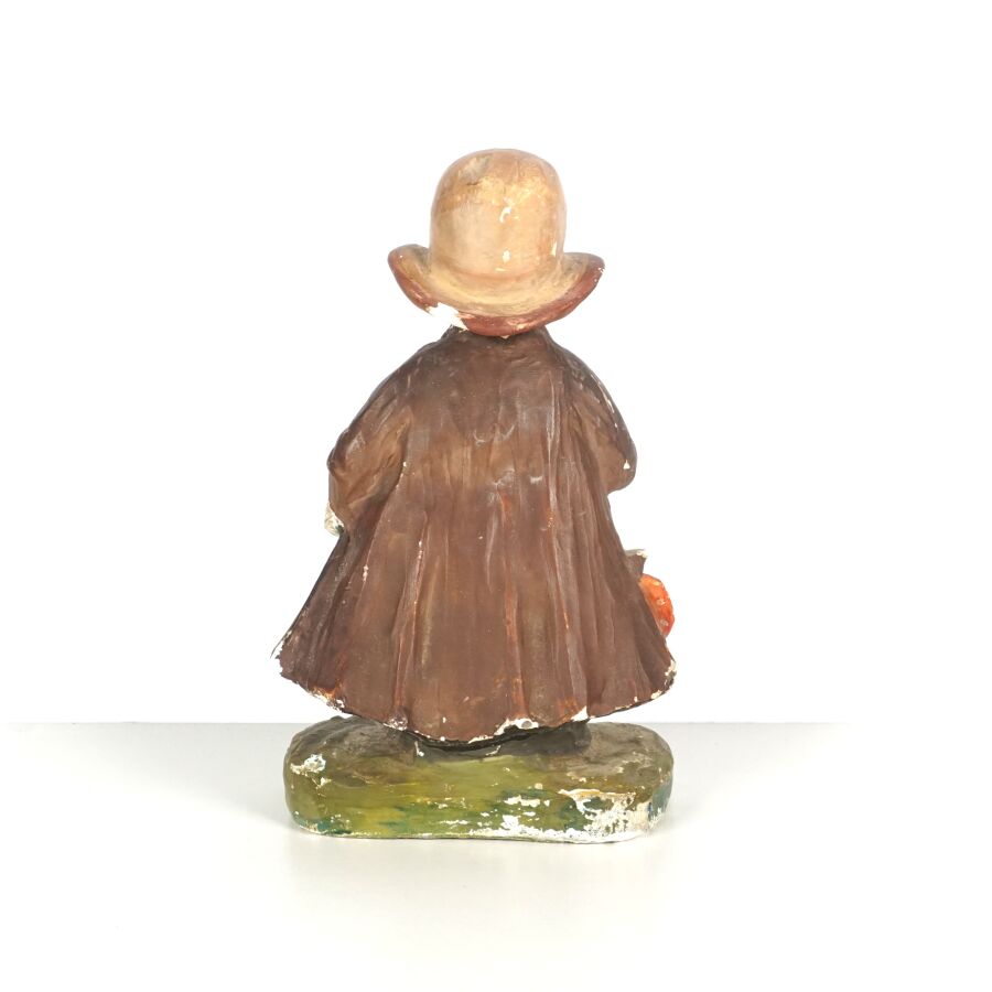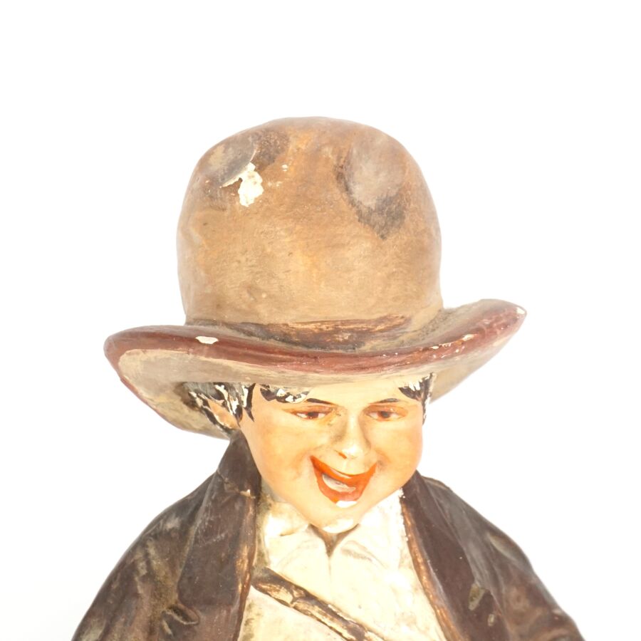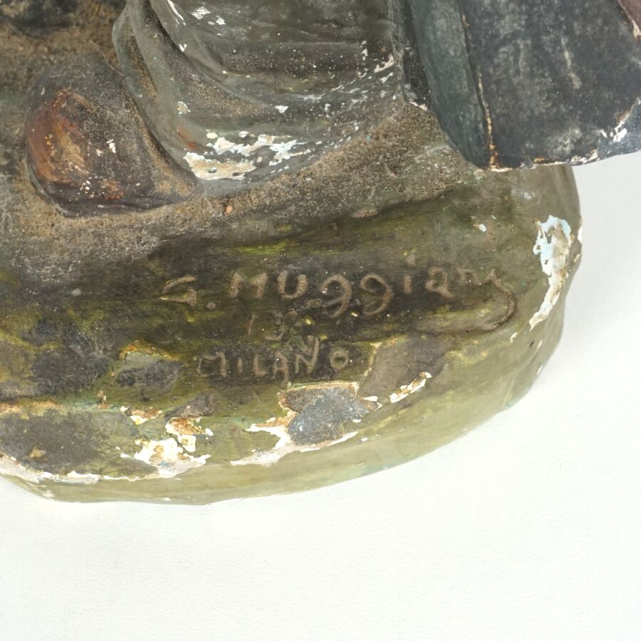 G. MUGGIAN (XXe), "Personnage en trombinoscope", sculpture en plâtre polychromé signée sur la terrasse, H. 28 cm (usures).