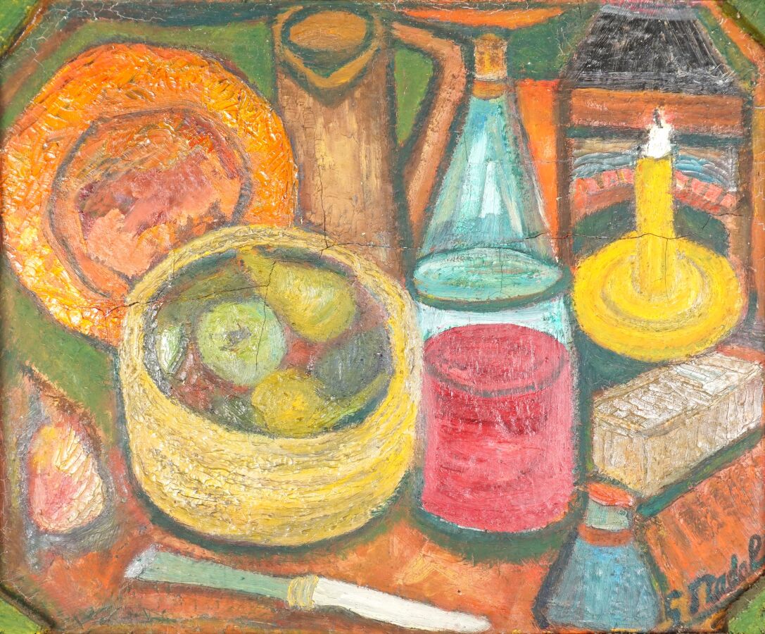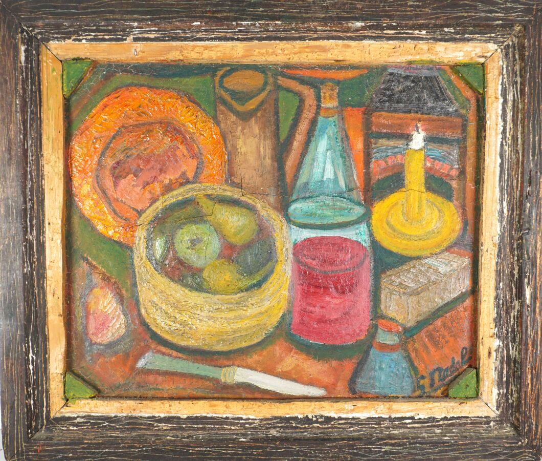 G. NADAL (XXe), " Nature morte aux pommes et à la carafe de vin rouge ", huile sur matière composite, signée en bas à droite, 45 x 54 cm (écaillures).