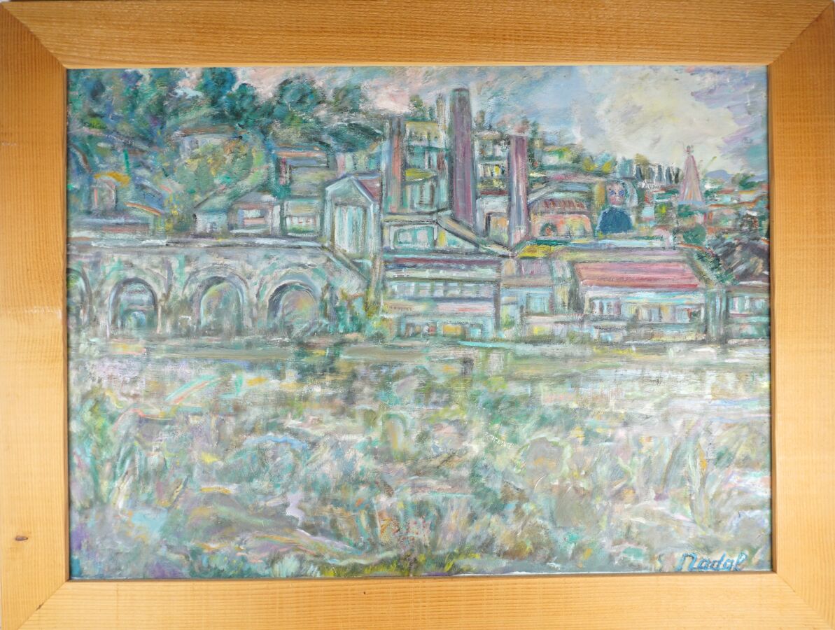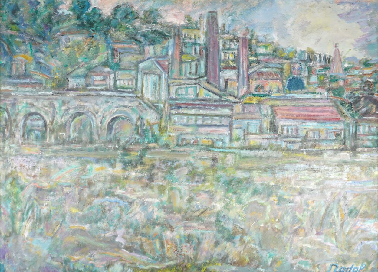G. NADAL (XXe), "Usine au bord du fleuve", huile sur panneau, signée en bas à droite, 73 x 101 cm.