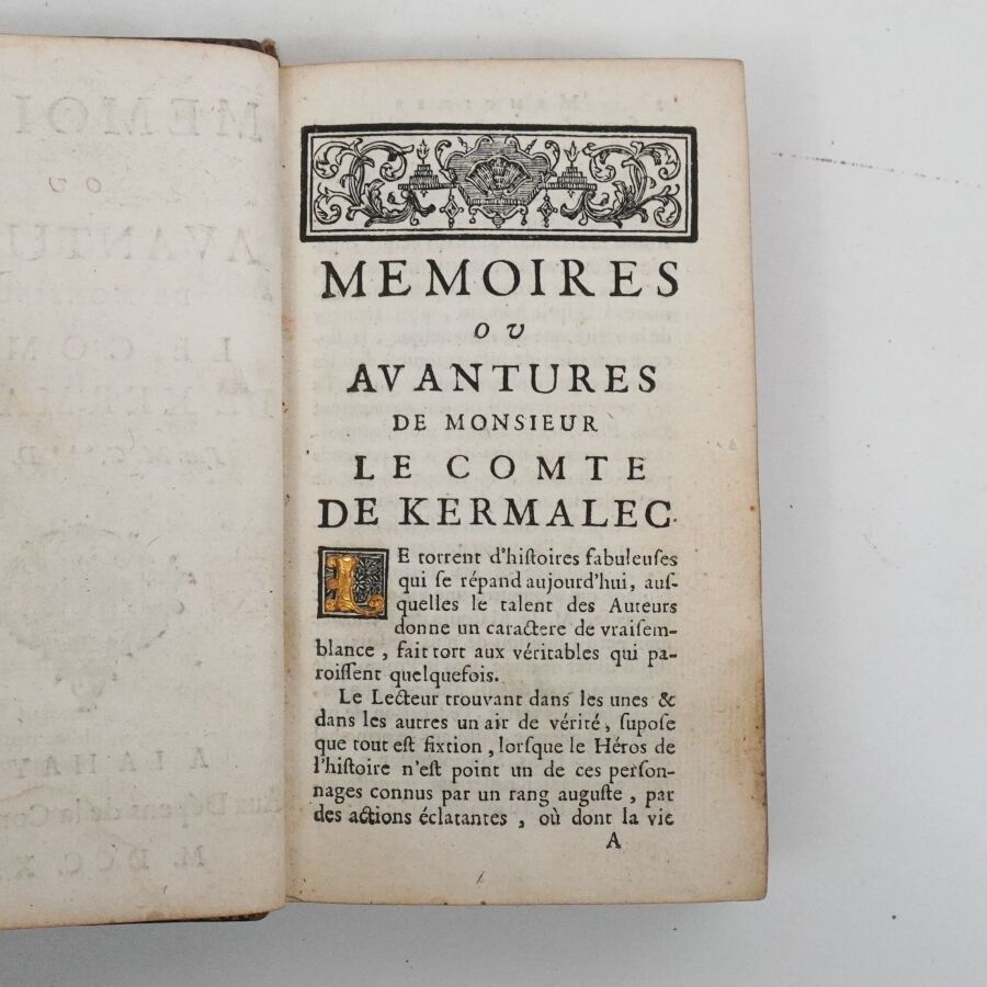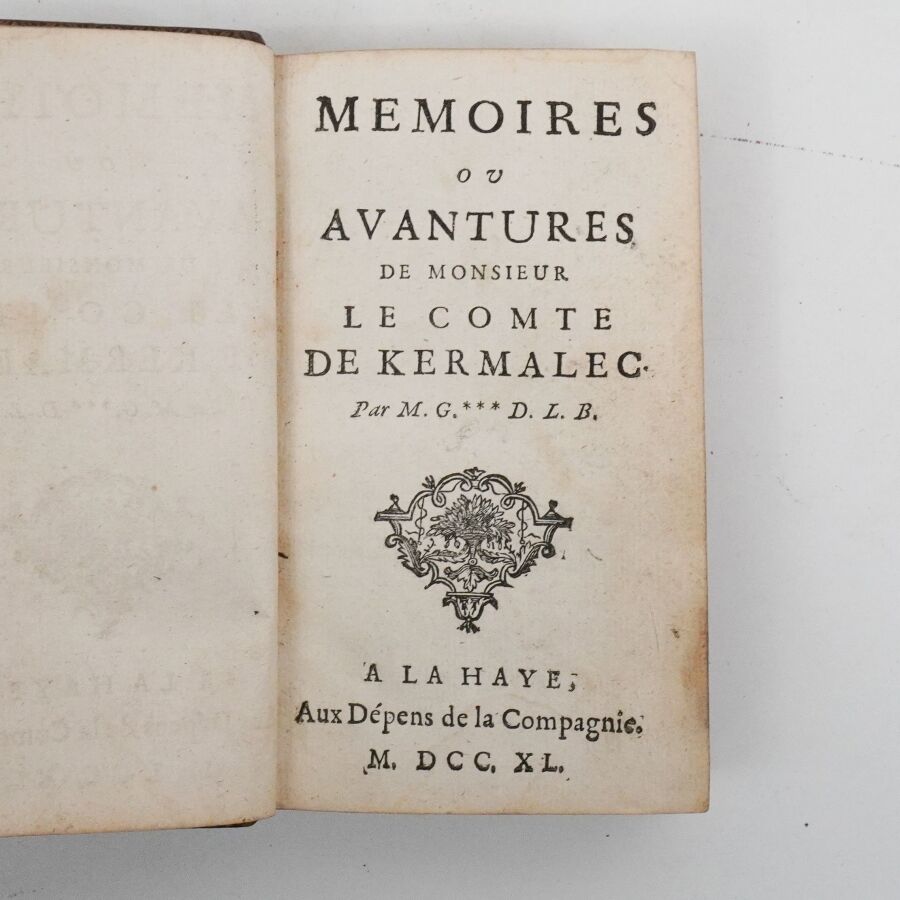 [GAILLARD DE LA BATAILLE (Pierre Alexandre)]. Mémoires ou avantures de monsieur le comte de Kermalec. La Haye, aux dépens de la Compagnie, 1740-1741. 2 tomes reliés en 1 vol. in-12, veau brun, dos à nerfs orné, pièce de titre, roulette intérieure, tranches rouges (reliure de l'époque).