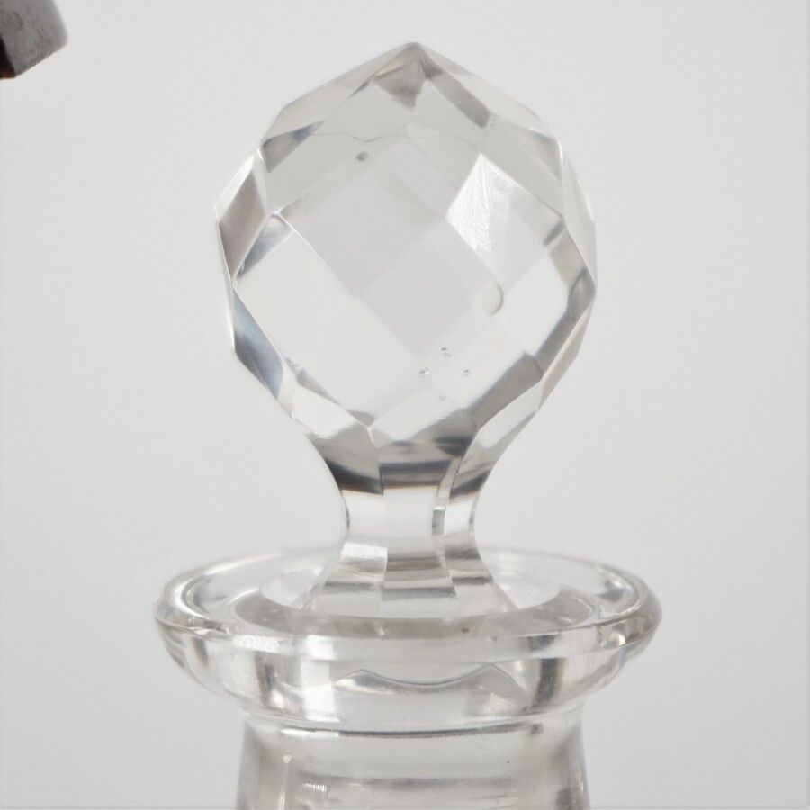 GALLIA BAYARD : Huilier - vinaigrier en cristal et métal chromé, avec leurs bouchons, sur socle à gradins, poignée en ébène, flacons et bouchons numérotés 422 et 130 sous la base, H. 18 cm (infimes égrenures, petites usures sur la structure en métal).