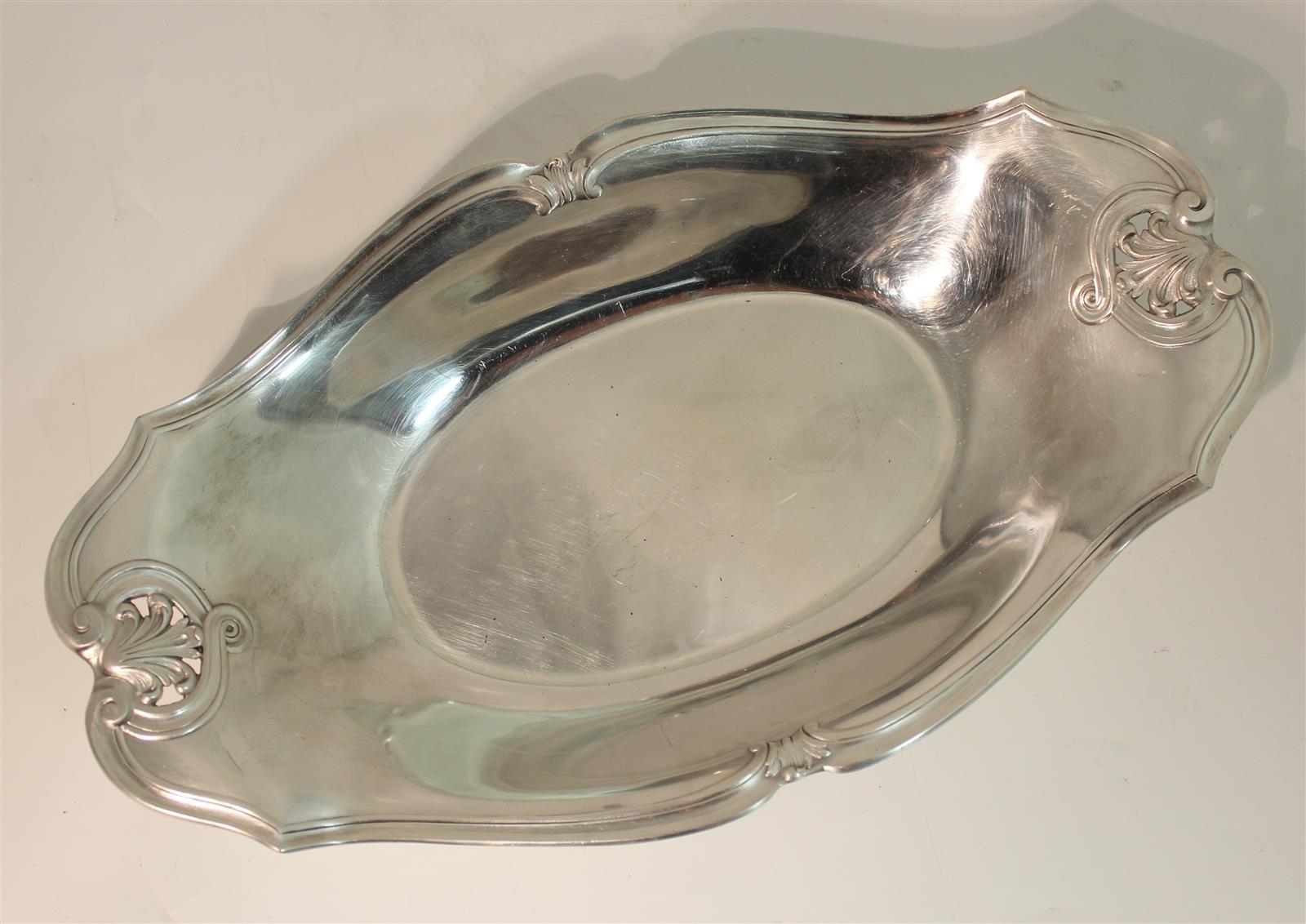 GALLIA Production CHRISTOFLE : Corbeille oblongue en métal argenté, à bord mouvementé, les anses ajourées à décor feuillagé, L. 35.5 cm