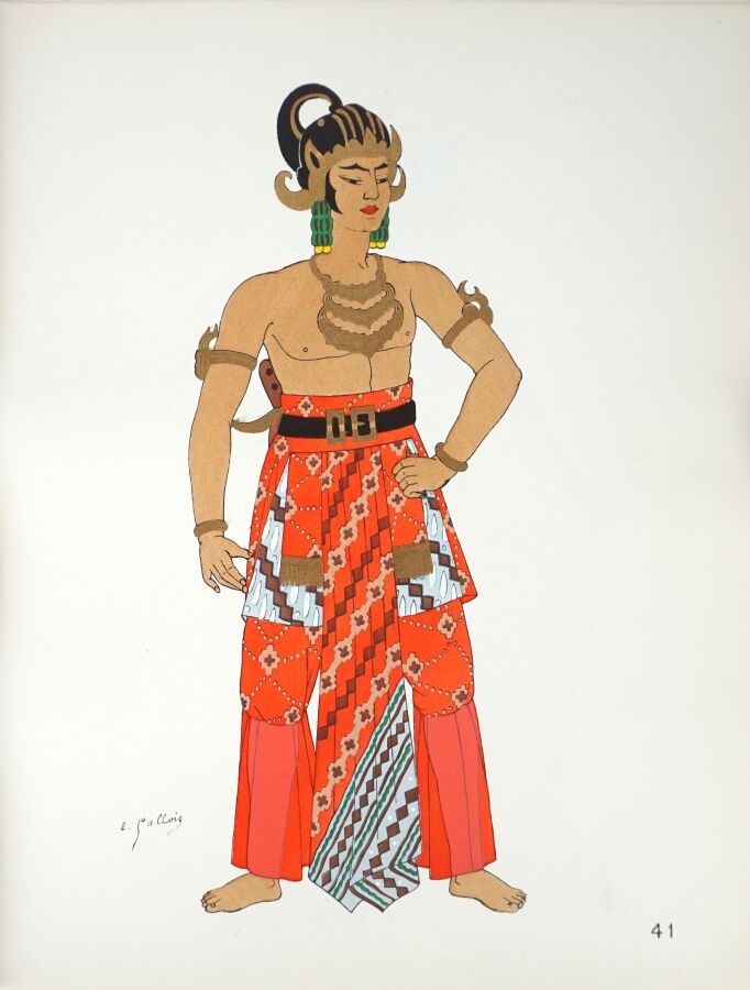 Album de 48 ravissantes planches de costumes coloriées au pochoir par Henri Hus, maître enlumineur, d'après les dessins d'Émile Gallois, dont un grand nombre rehaussées d'or.