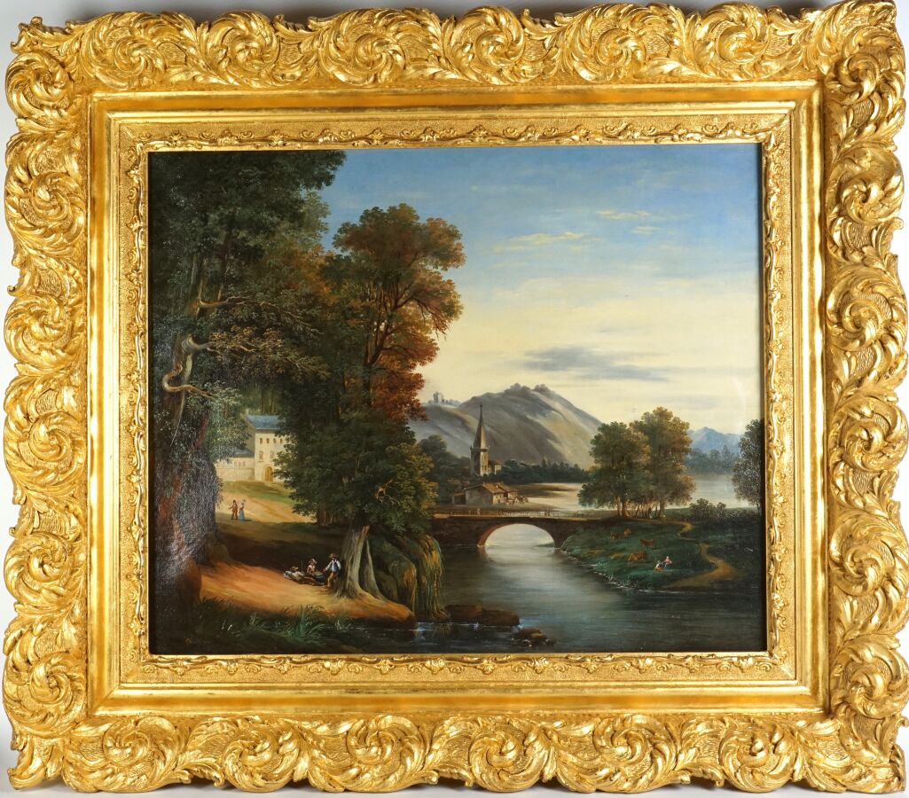 GAMELIN (XIXe), "Paysage animé au vieux pont et au clocher" 1852, huile sur toile, signée et datée en bas à gauche, 52 x 64 cm (petites restaurations anciennes).