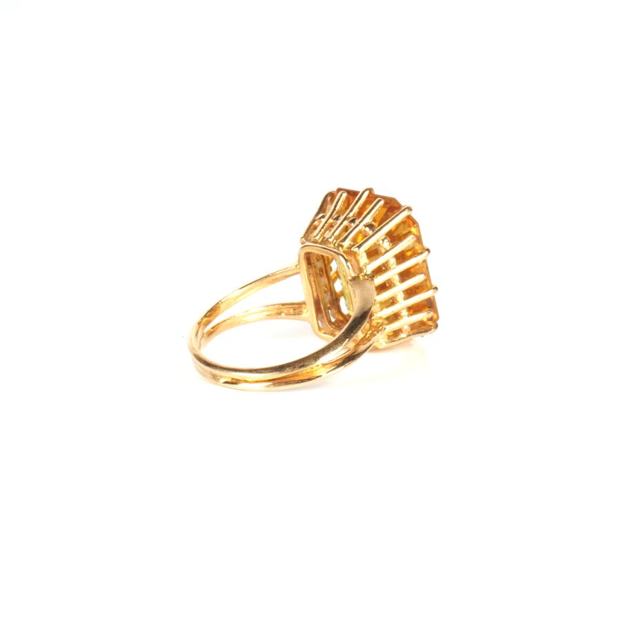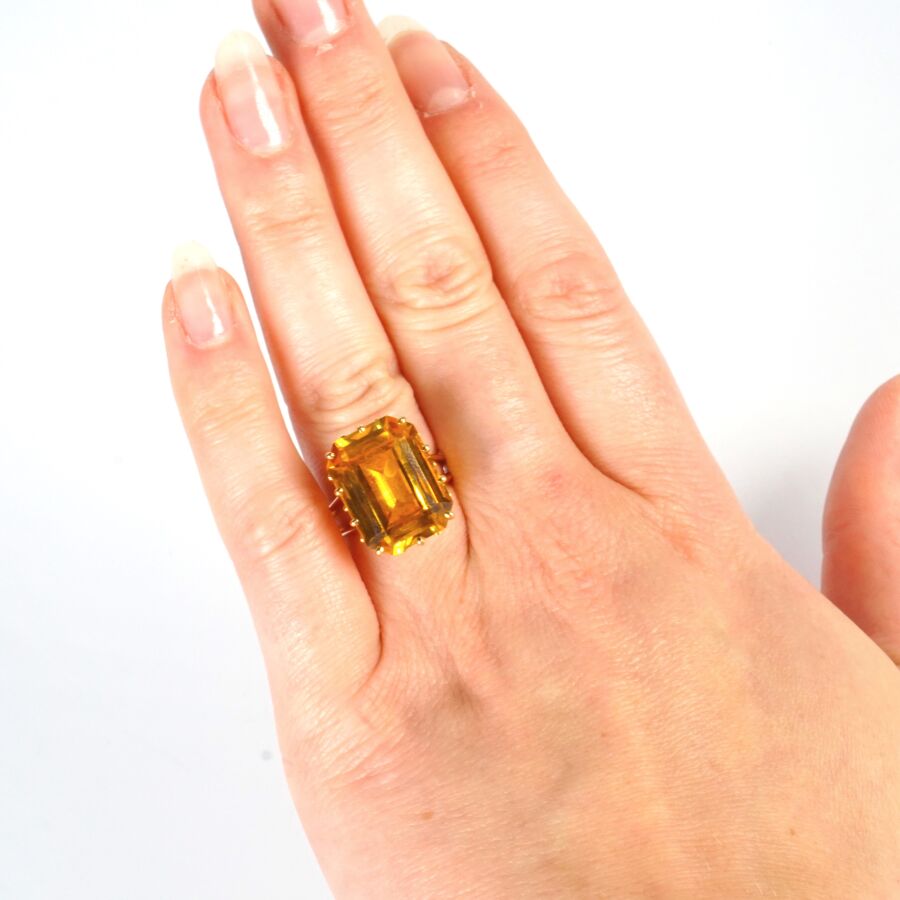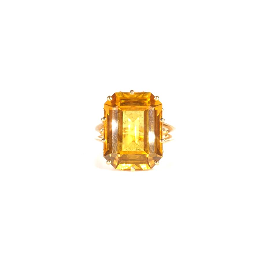 GARANTIE Bague en or jaune 18K (750/oo) sertie 10 griffes d'un important saphir de couleur jaune orangé, taille émeraude (D. 1.7 x 1.3 cm), montants double, TDD. 53. Poids brut : 8.6 g environ (AC).