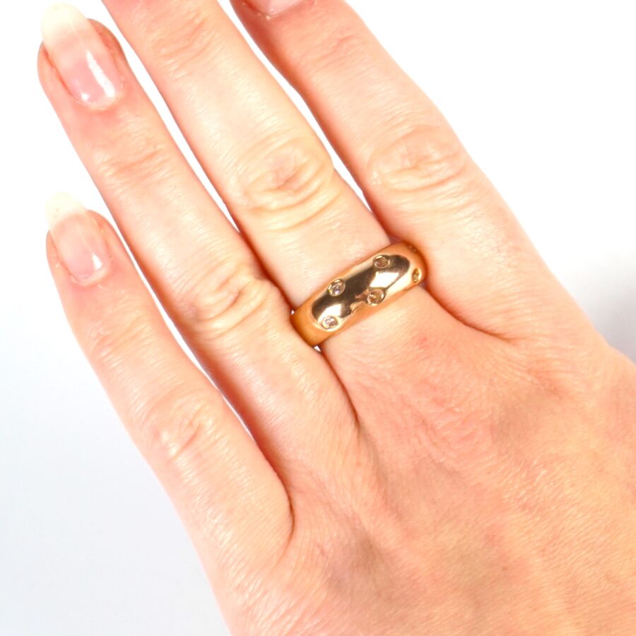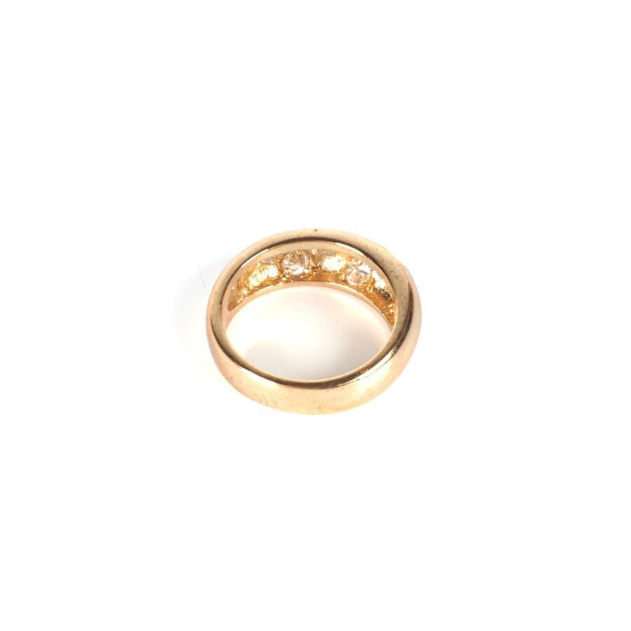 GARANTIE Bague jonc en or jaune 18K (750/oo), plateau bombé serti de 6 pierres blanches imitant le diamant, Larg. 7.5 mm. TDD. 57. Poids brut : 5.7 g environ (AC).