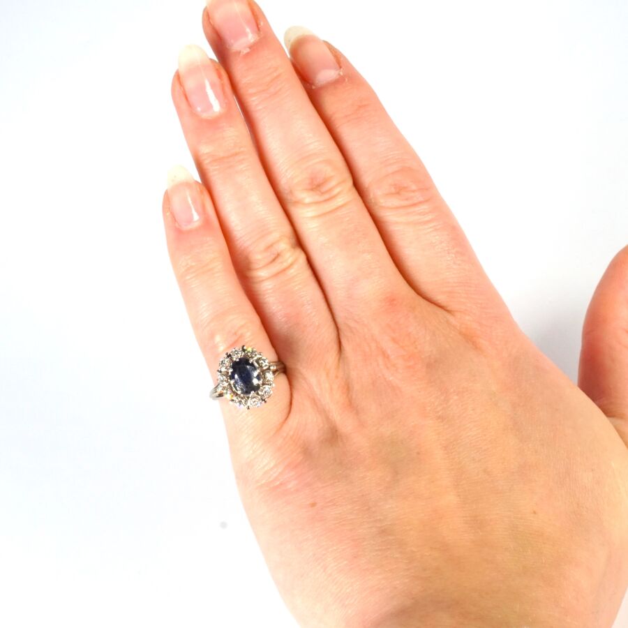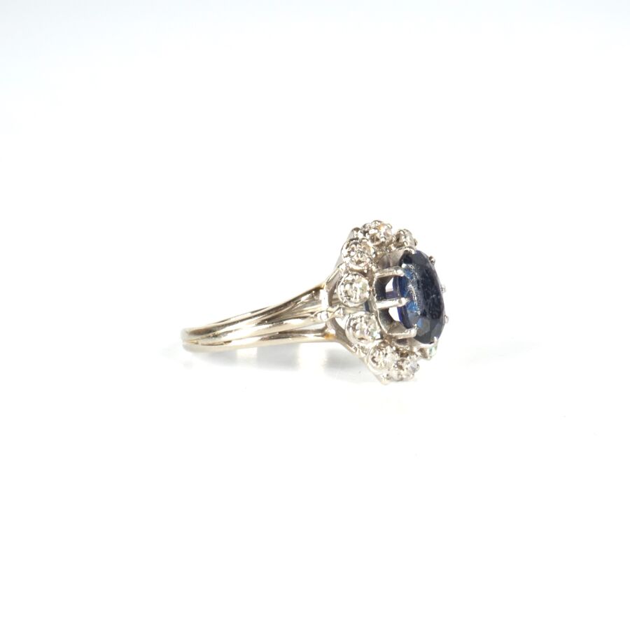 GARANTIE Bague "Marguerite" en or gris 18K (750/oo), sertie au centre d'un saphir bleu de taille ovale (D. 8 x 5 mm) dans un entourage de 10 diamants taille brillant, Dim. Tête de bague : 1.4 x 1.2 cm. TDD. 50. Poids brut : 4.4 g environ (égrisures à la pierre) (AC).