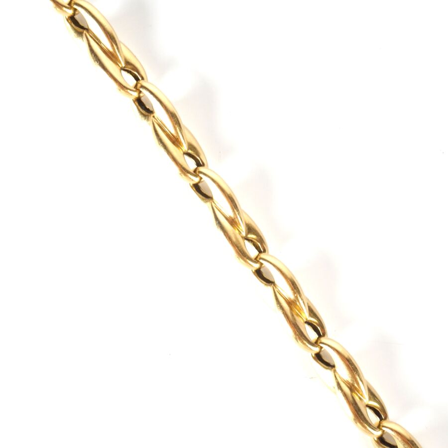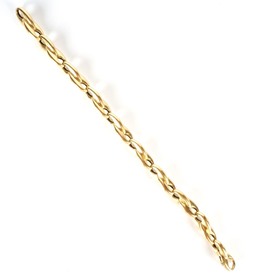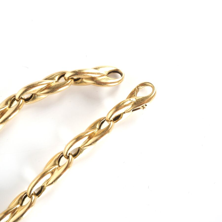 GARANTIE Bracelet en or jaune 18K (750/oo), maille à deux anneaux entrecroisés, fermoir mousqueton, L. Totale : 21.2 cm. Larg. 8 mm. Poids brut : 34.4 g environ (deux maillons à refixer) (AC).