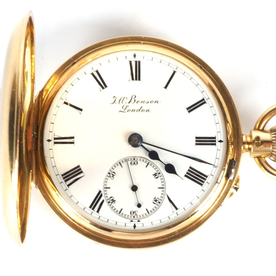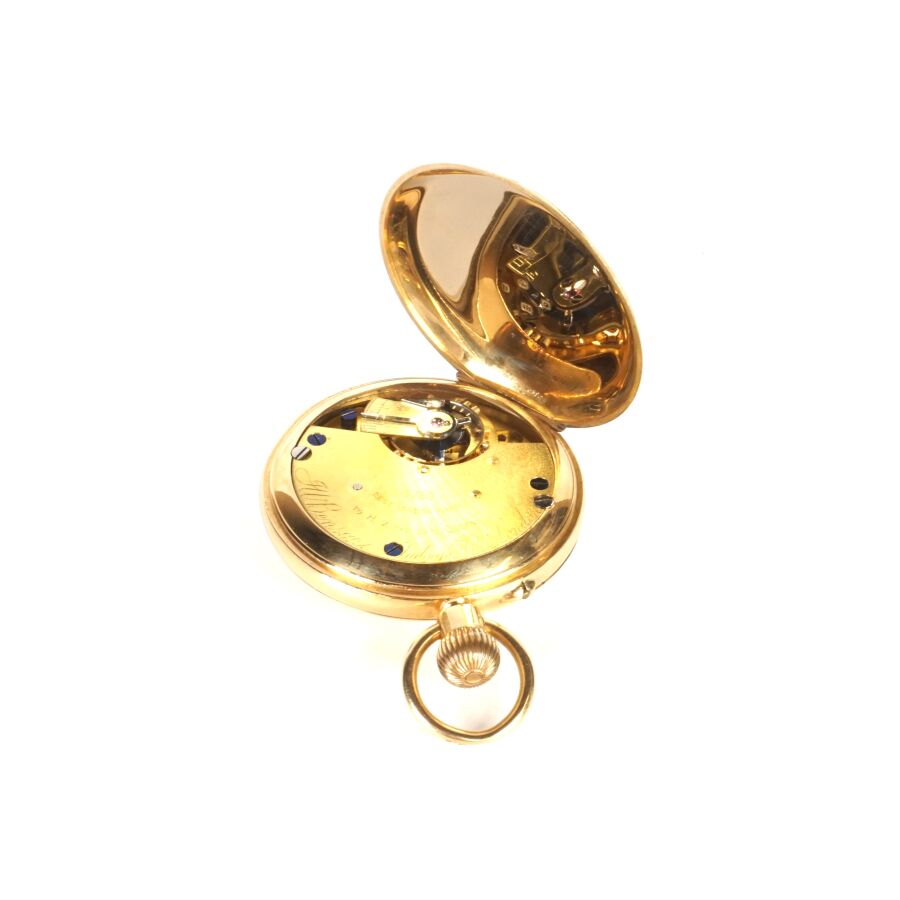 GARANTIE J.W. BENSON - LONDRES : Montre de poche en or jaune 18K (750/oo), cadran émaillé blanc, chiffres romains pour les heures et chemin de fer pour les minutes, signé, cadran des secondres à 6H, boîtier extérieur cranté avec chiffres romains pour les heures, sans cuvette intérieure, Diam. Boîtier : 4.2 cm. H. Avec bélière : 6.8 cm. Poids brut : 94 g environ (AC).