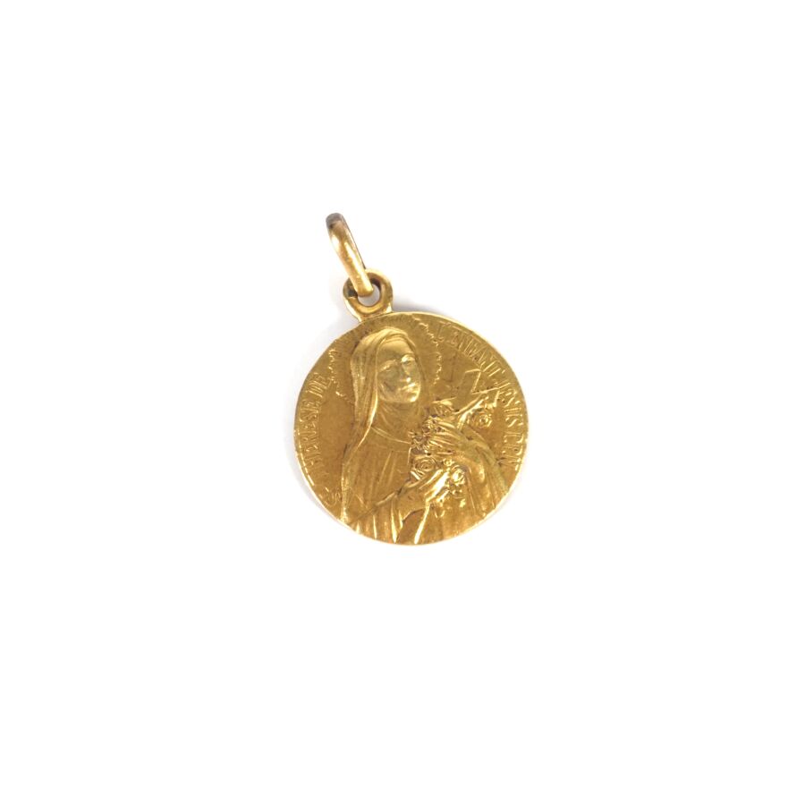 GARANTIE Médaille "Sainte-Thérèse" en or jaune 18K (750/oo), Diam. 1.6 cm. H. Avec bélière : 2.3 cm. Poids brut : 2 g environ (AC).