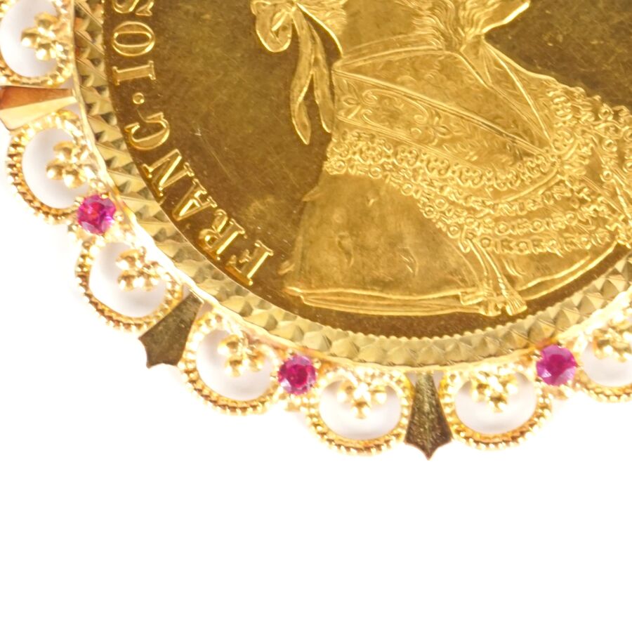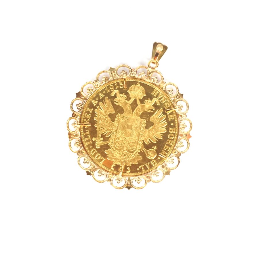 GARANTIE Pendentif "Monnaie", monture en or jaune 18K (750/oo) serti d'une monnaie 4 ducat or, 1915, Autriche, dans un entourage ciselé de trèfles et arcs perlés, alternant par 9 petites topazes roses taille ronde (D. 2 mm), Diam. 5.1 cm. H. Avec bélière : 6.2 cm. Poids brut : 19.5 g environ (AC).
