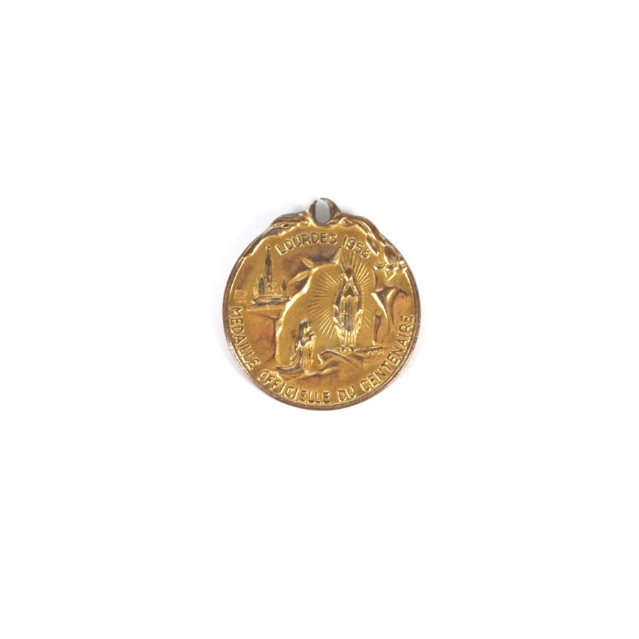 GARANTIE Petite médaille en or jaune 18K (750/oo), portant l'inscription "Lourdes - médaille de l'année jubilaire", Diam. 1.8 cm. Poids brut : 2.4 g environ (bélière accidentée) (AC).