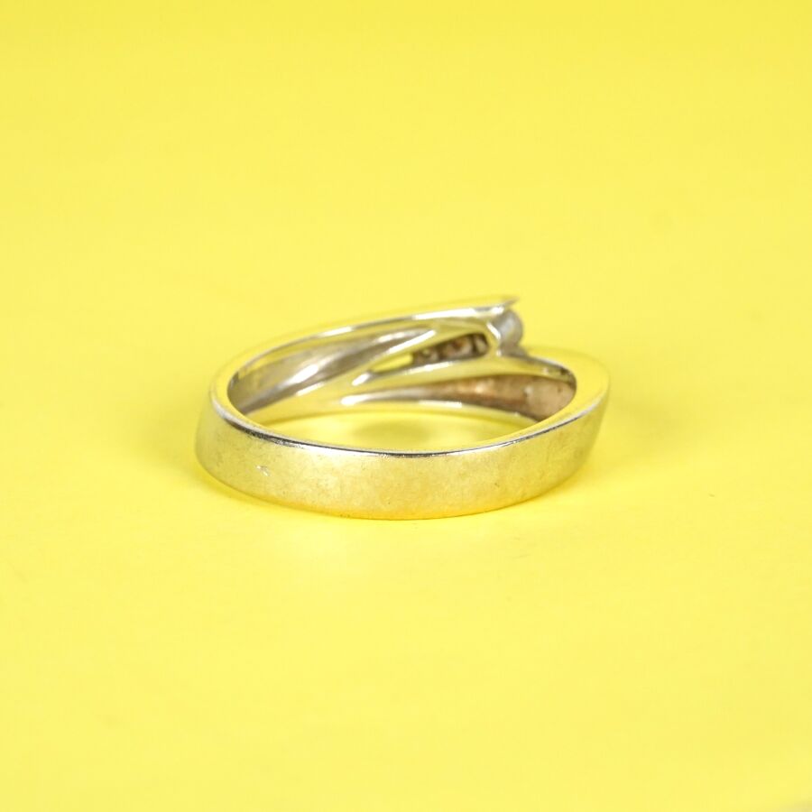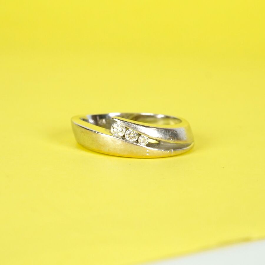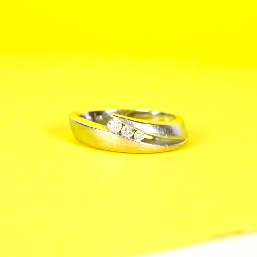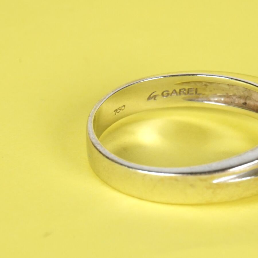 GAREL : Bague en or gris 18K (750/oo) à motif de deux lignes retenant au centre trois diamants en chute calibrant chacun 0.02 ct, 0.03 ct et 0.04/0.05 ct environ, signée à l'intérieur de l'anneau, TDD. 65. Larg. 7 mm. Poids brut : 9.2 g environ.