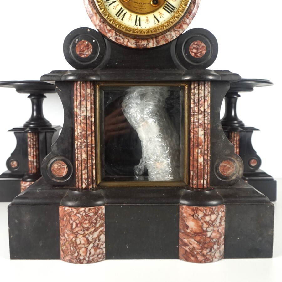 Garniture de cheminé, en marbre noir et marbre rouge veiné blanc, comprenant une pendule borne au cadran émaillé, chiffres romains, mouvement signé Comptoir Générale, H. Riondet à Paris (avec cache en verre), corps entouré de deux colonnes cannelées encadrant le balancier, accompagnée de ses cassolettes, époque Louis-Philippe, H. 47,5 x L. 27,5 cm (éclats sur le socle)