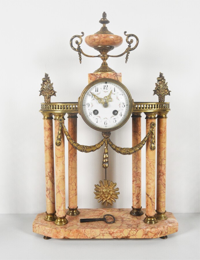 Garniture de cheminée de style Louis XVI en marbre rose, régule et laiton comprenant une pendule portique, le cadran en porcelaine émaillée polychrome à décor de fleurettes encadré d'une terrasse accueillant deux vases fleuris et surmonté d'un vase à l'antique, chiffres arabes pour les heures, ornementation de guirlandes et balancier figurant un soleil, le mouvement marqué "BONNET ET P.POTTIER à Paris", accompagnée de ses deux cassolettes à motif de vase de forme balustre, époque Napoléon III, H. 47 et 34 cm (avec un balancier et une clé).